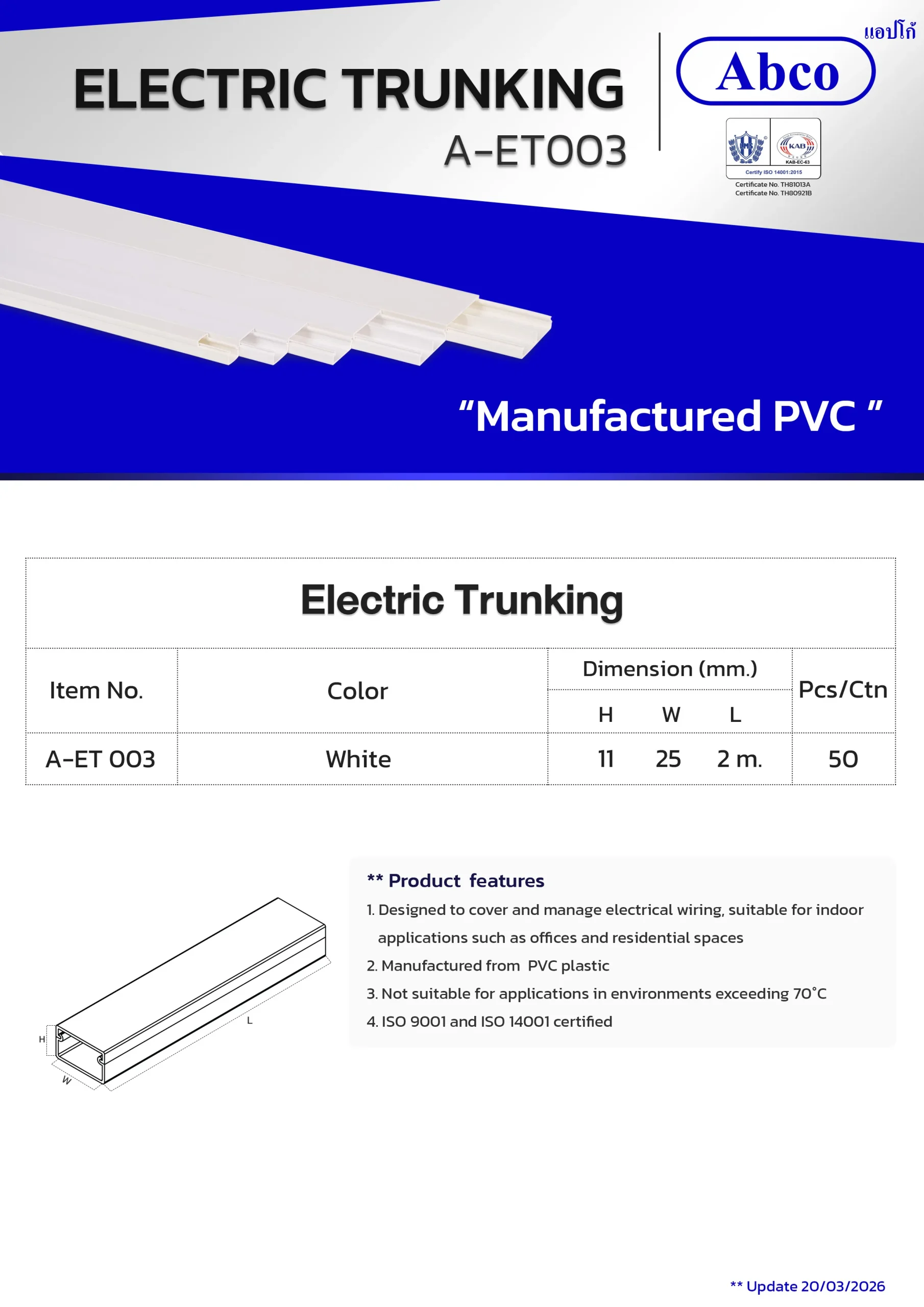Abco Electric Trunking offers a consistent height across all models, ensuring a clean and uniform appearance in any installation area. The ET001 and ET002 models come with pre-installed double-sided tape for easy installation, eliminating the need for wall drilling. Larger models are equipped with separator panels to enhance cable management. Additionally, the trunking features slotted holes on the bottom to simplify installation. Manufactured from high-quality PVC plastic, this trunking provides both durability and a professional finish.