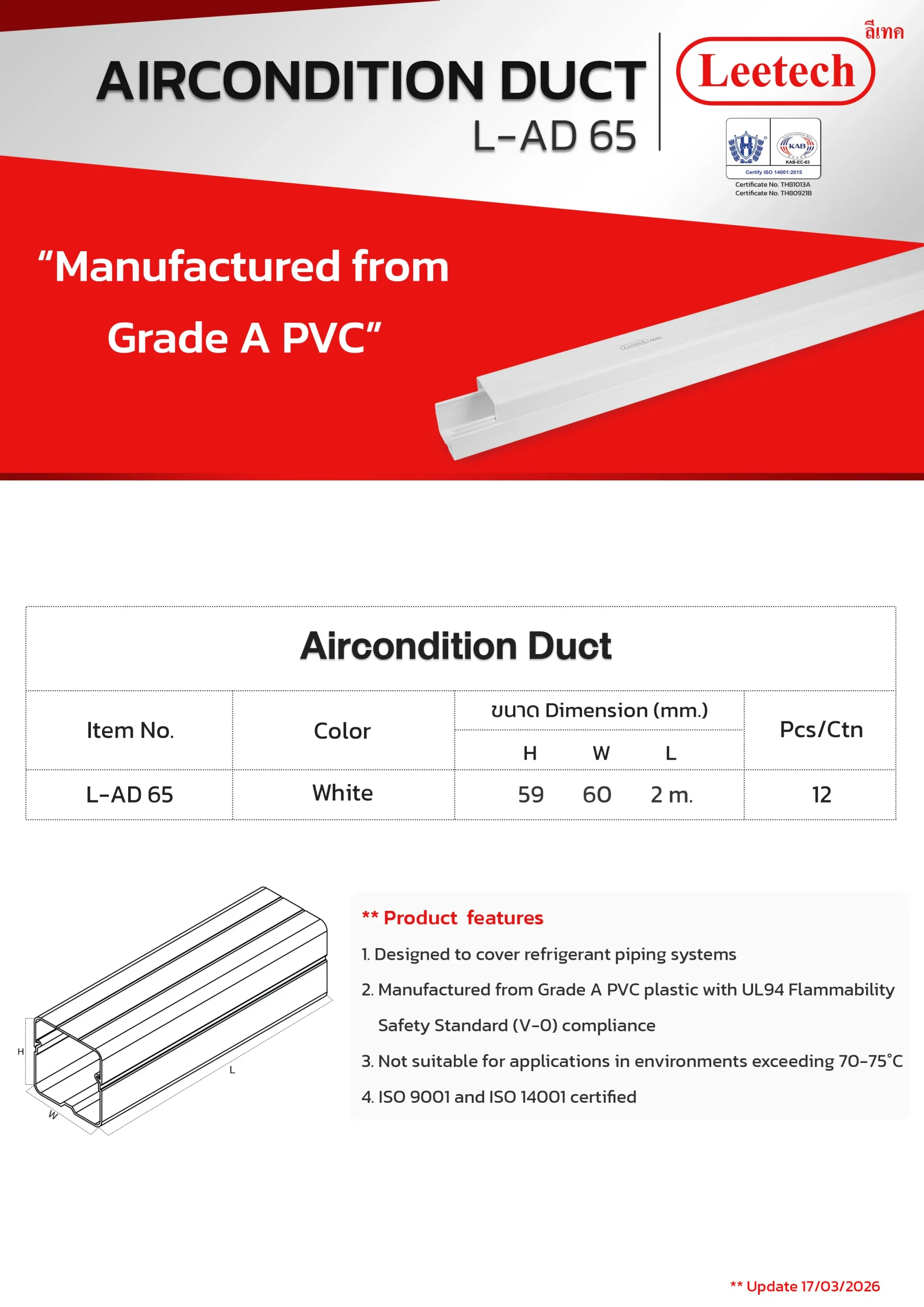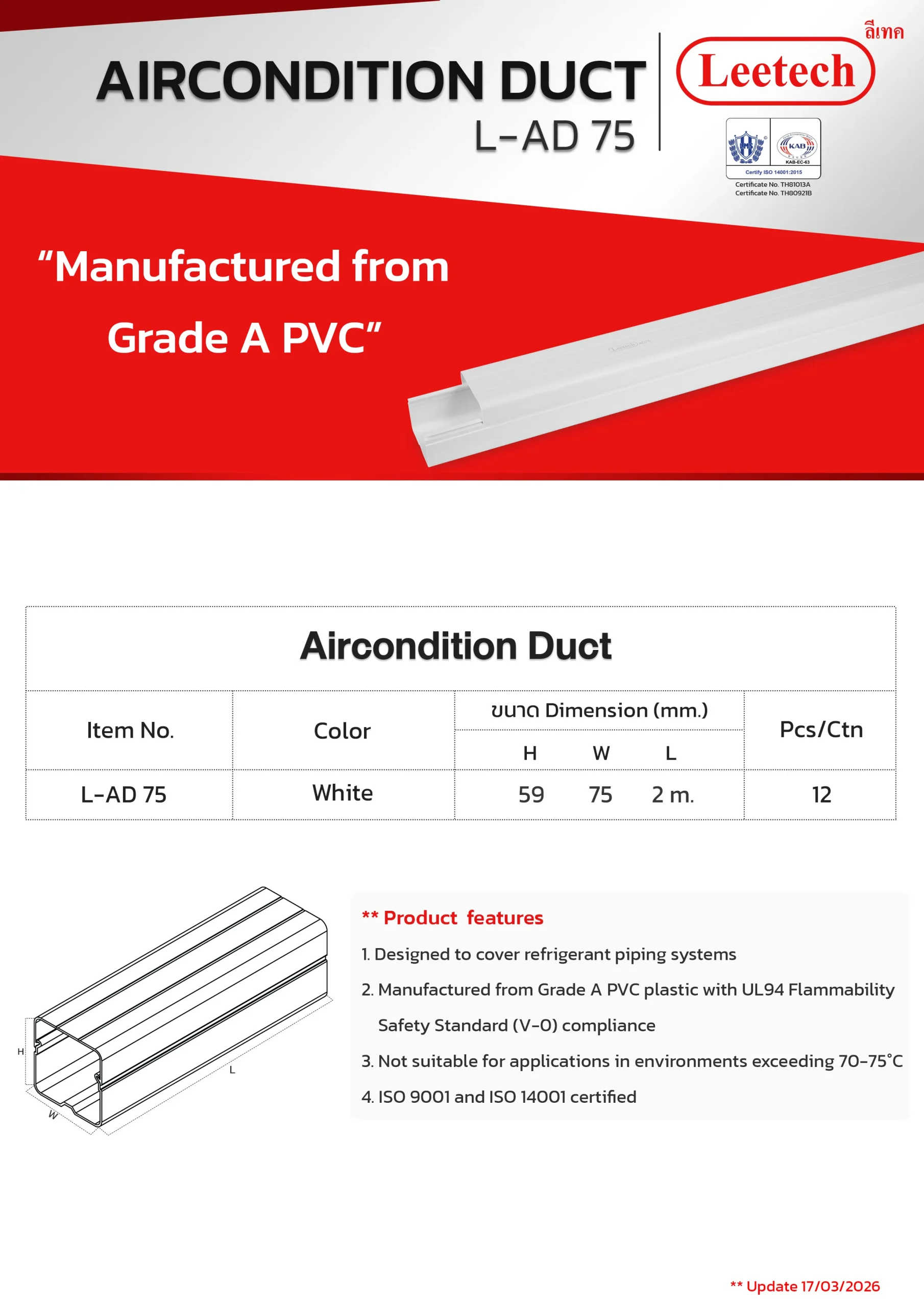 Leetech Air Condition Duct is engineered to enclose refrigerant piping systems, offering a clean, aesthetically pleasing appearance along with enhanced thermal insulation. The duct boasts a modern design and high durability, making it suitable for both indoor and outdoor applications. A variety of fittings and accessories are available to streamline installation and ensure a consistent look. This product is manufactured from high-quality PVC plastic for superior performance and longevity.