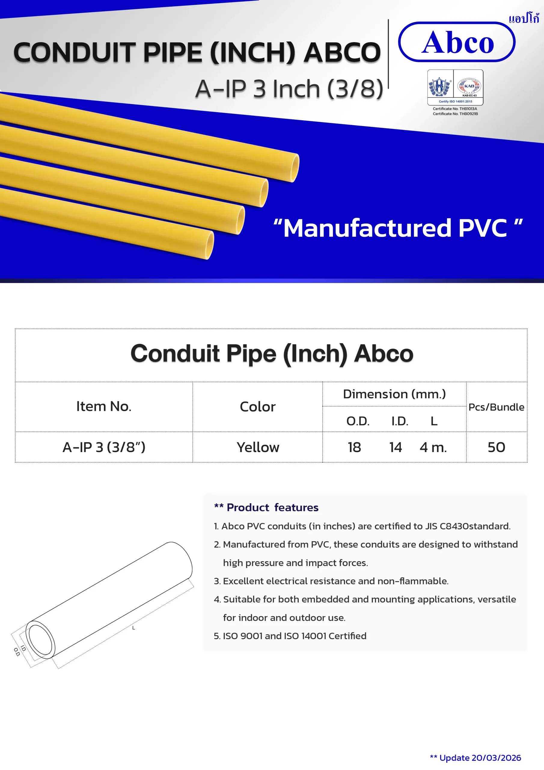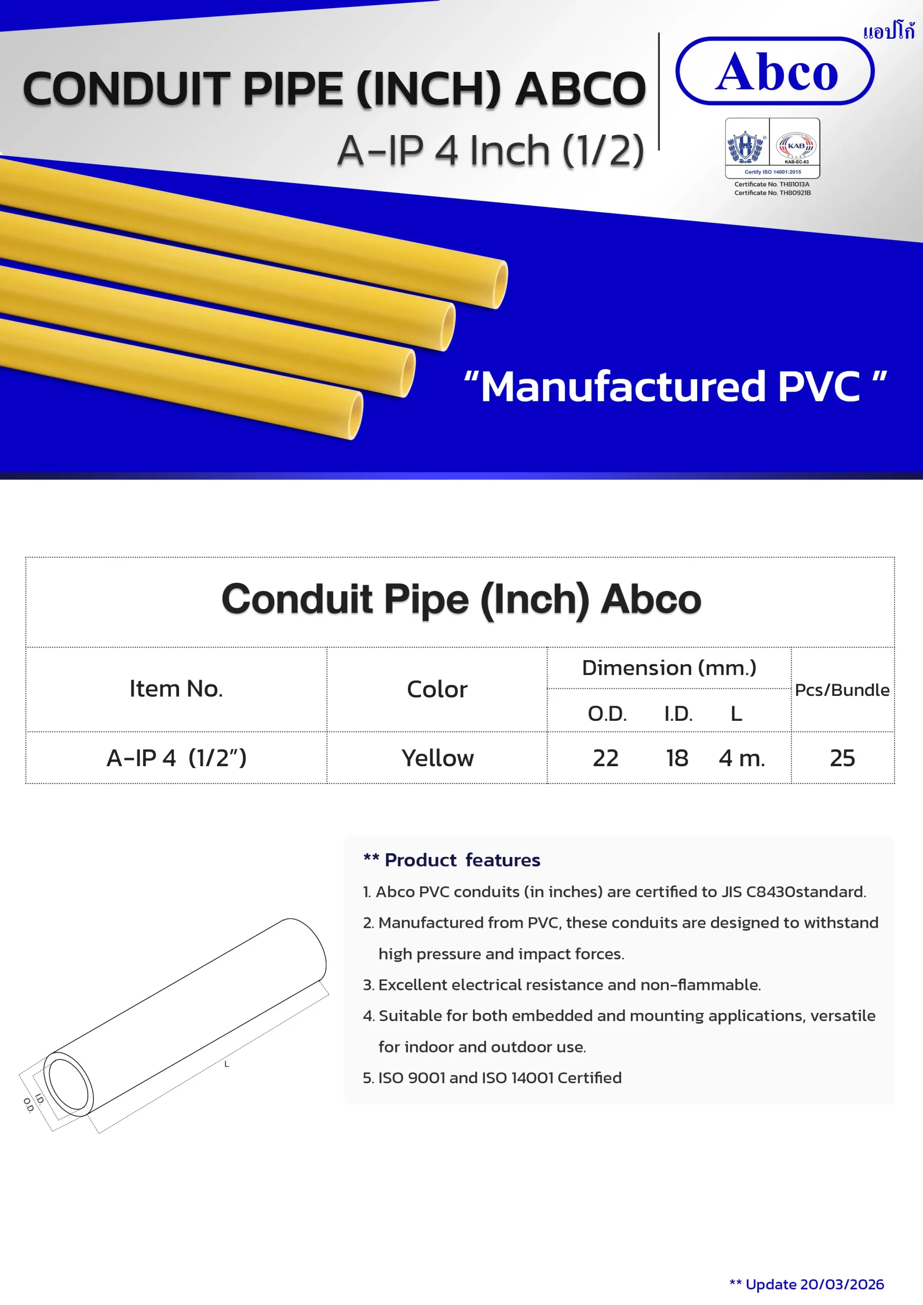 Home / ผลิตภัณฑ์ / Conduit Pipes and Pipe Fittings / Conduit Pipe (Inch) Abco (IP)