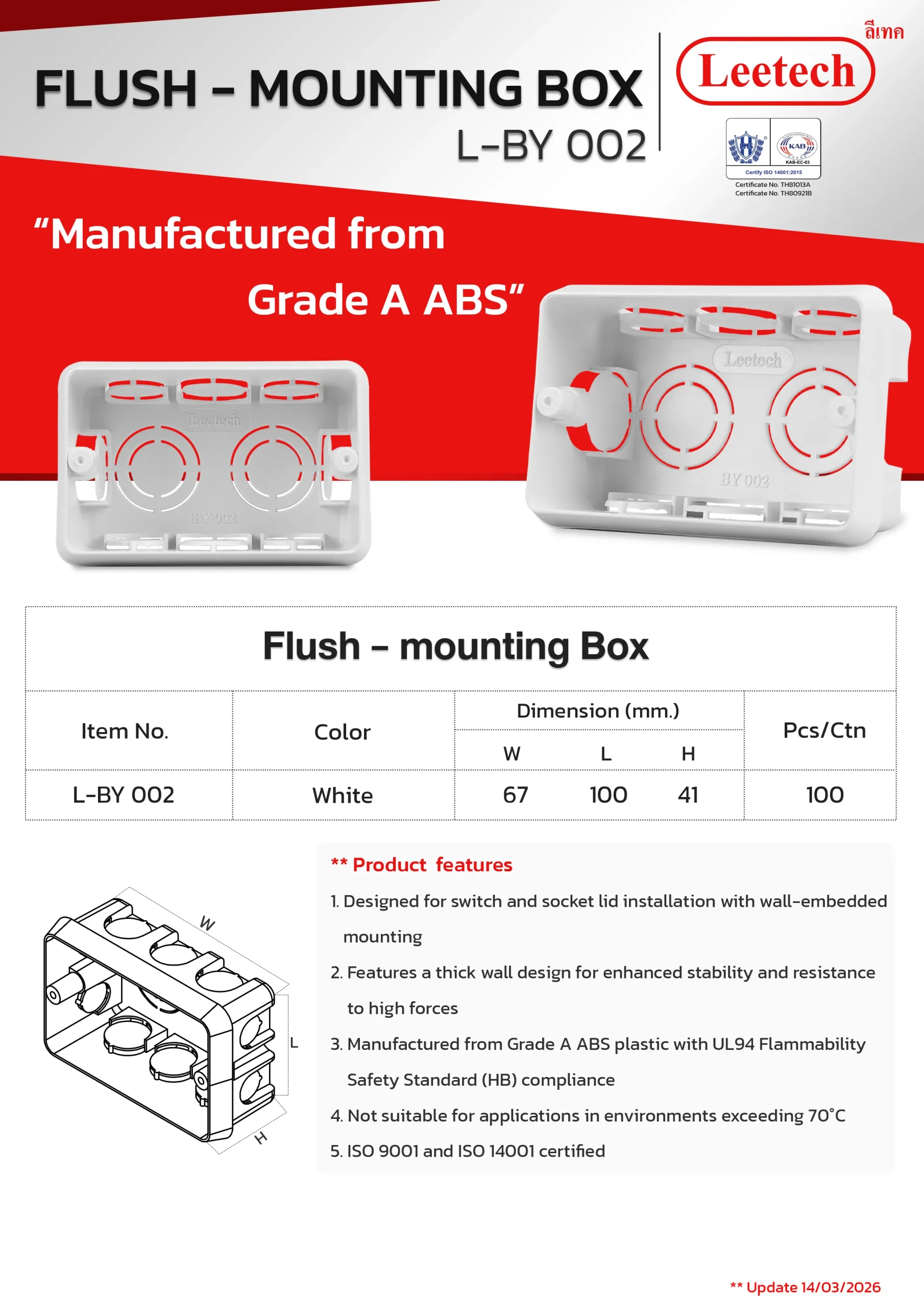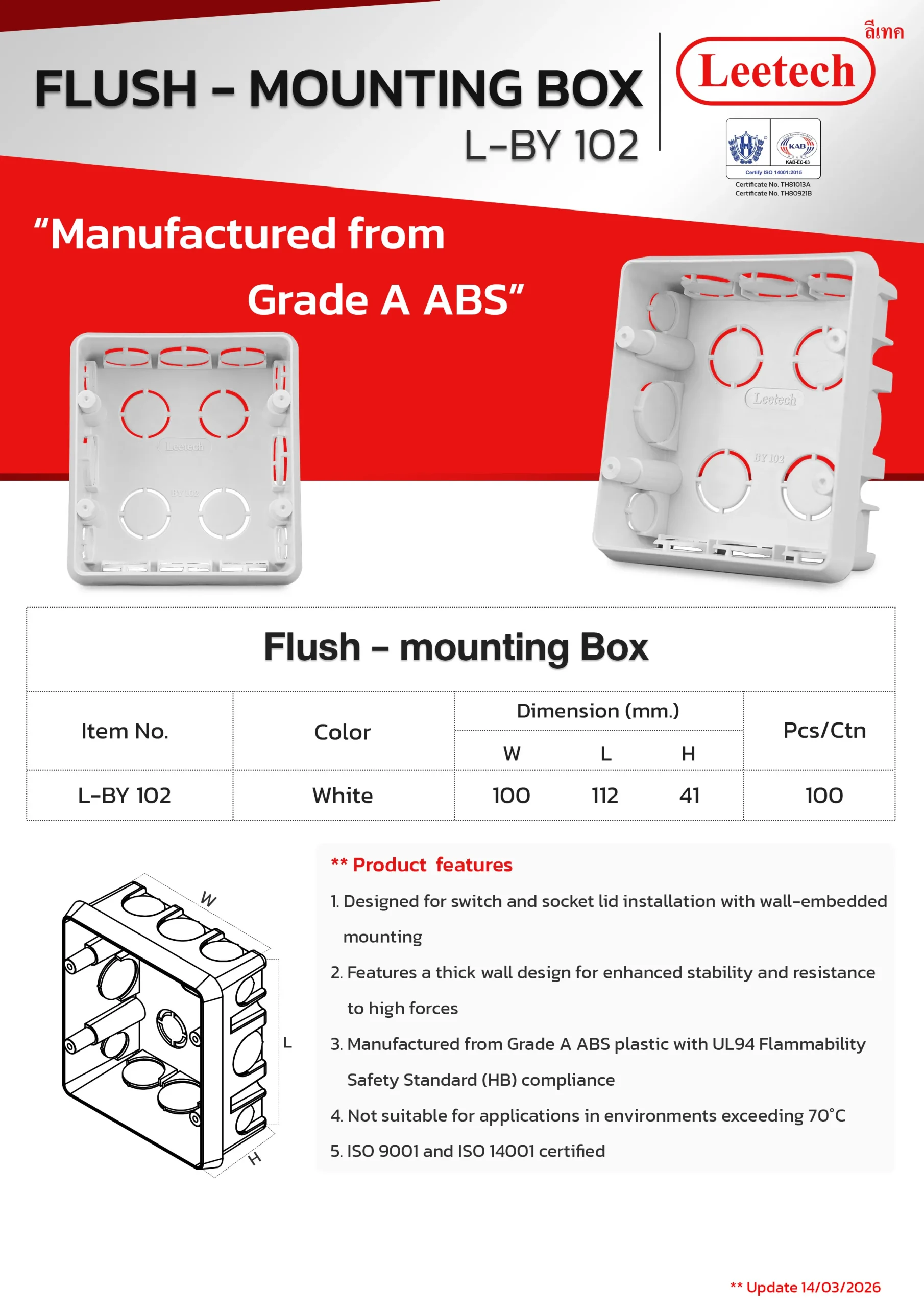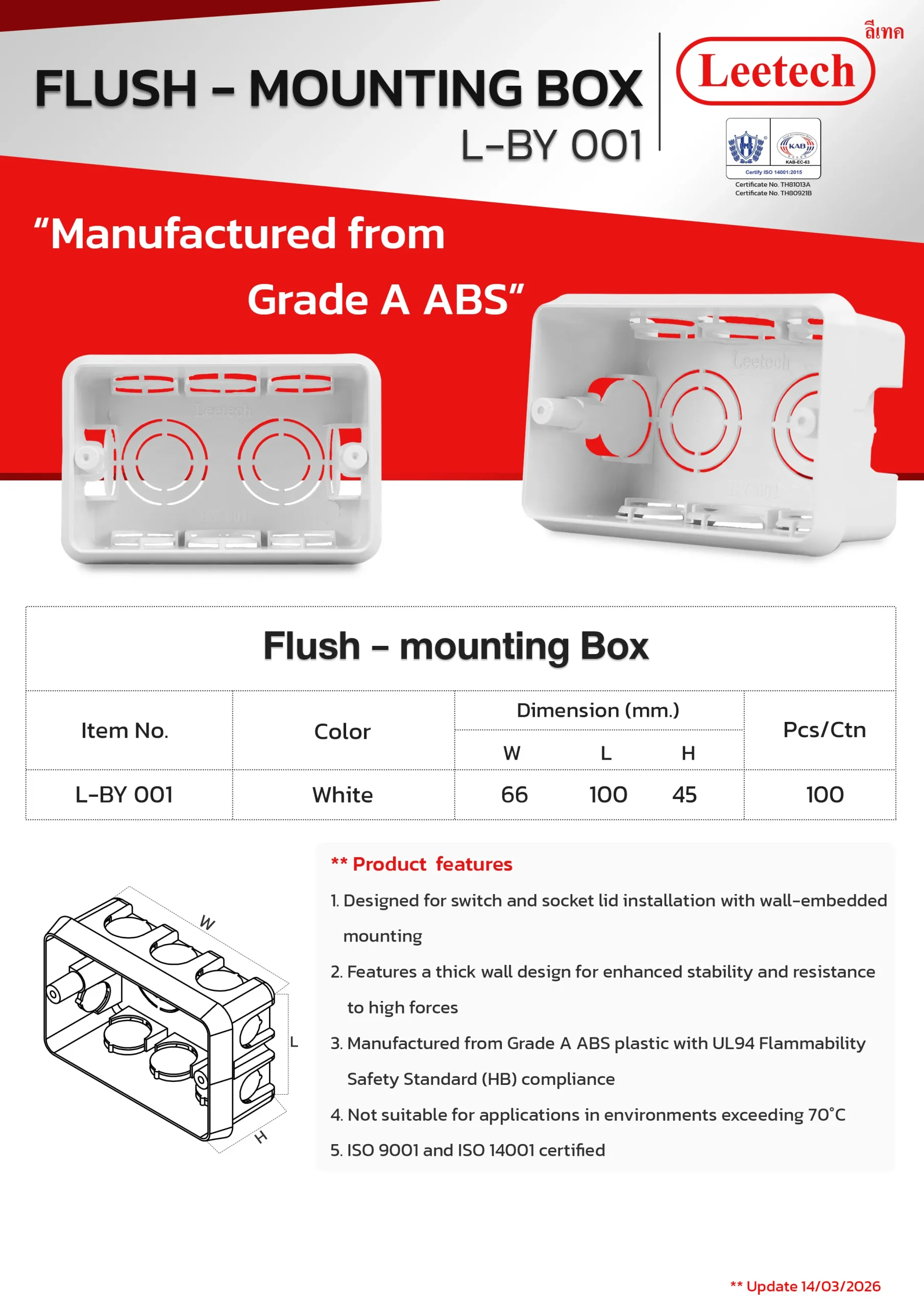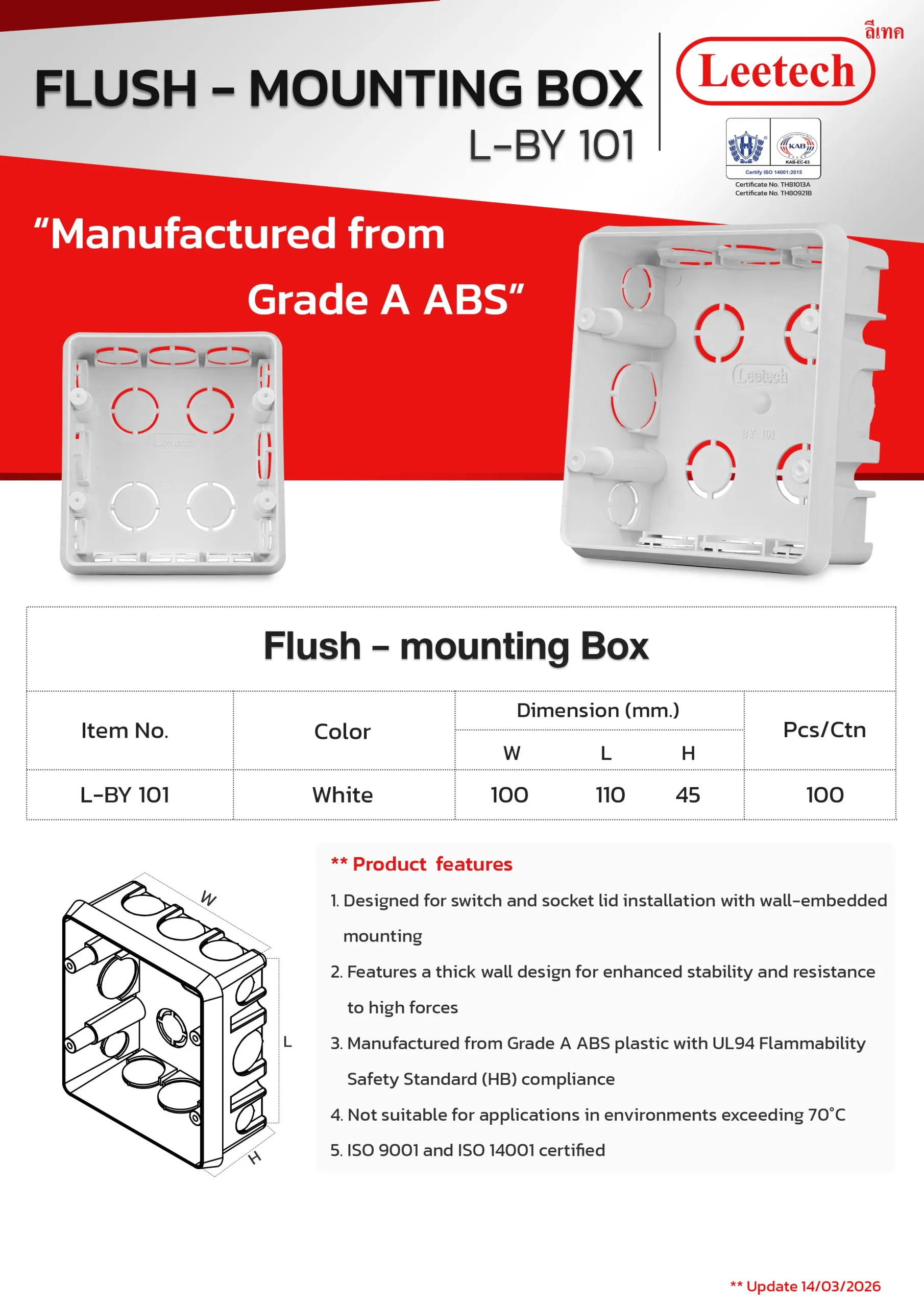 The Leetech Flush-Mounting Box is designed for switch and socket lid installation with wall-embedded mounting. It features a thick body design for enhanced stability and resistance to high pull forces. Top-grade plastic used to manufacture the box.