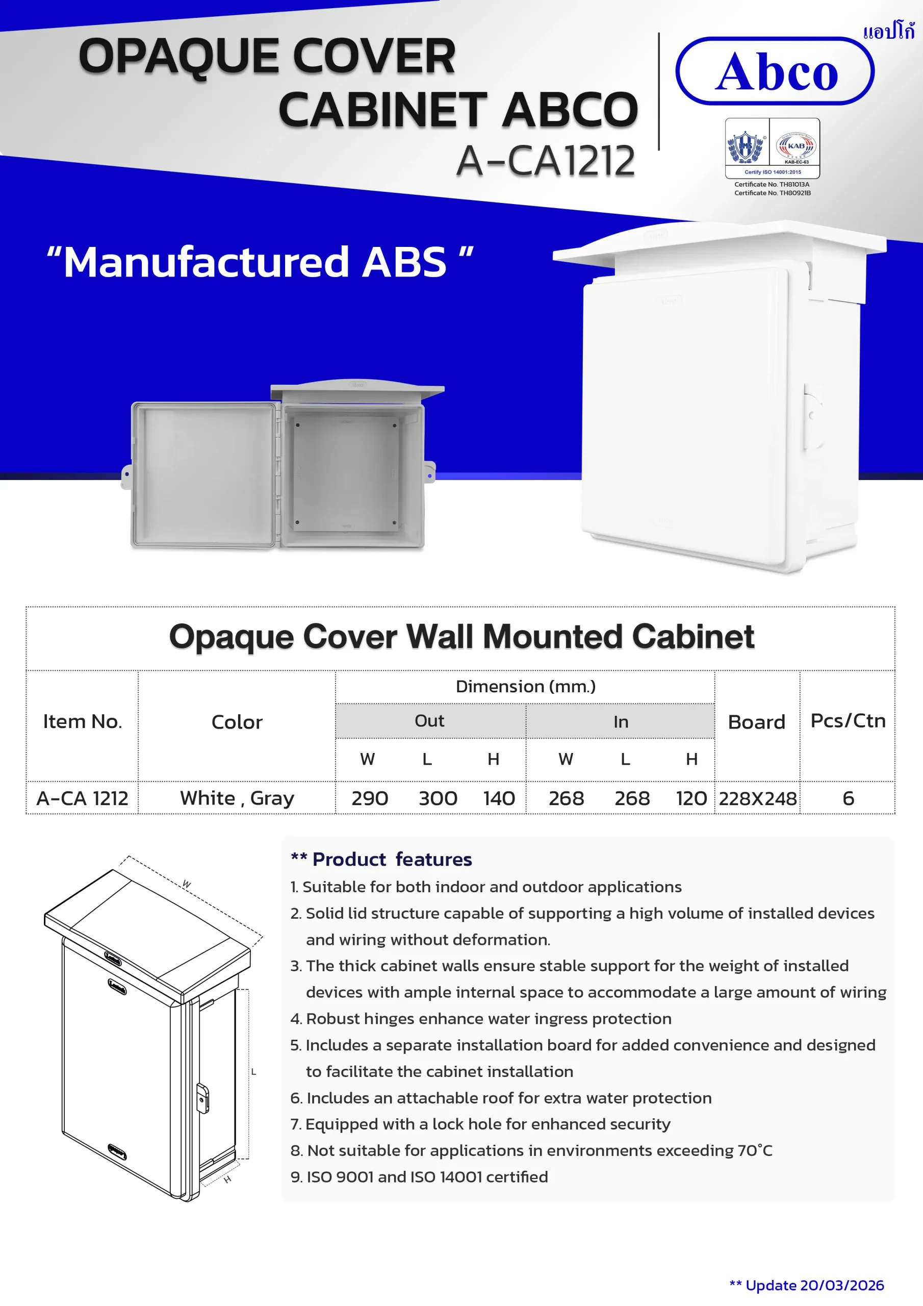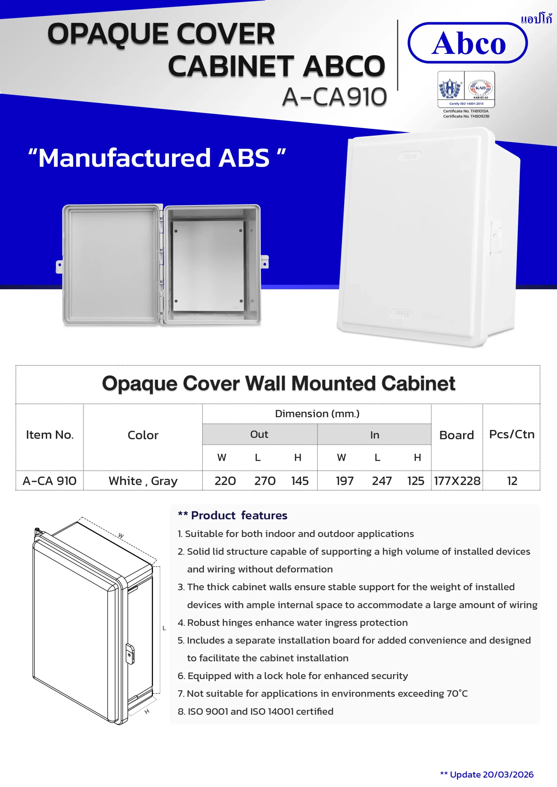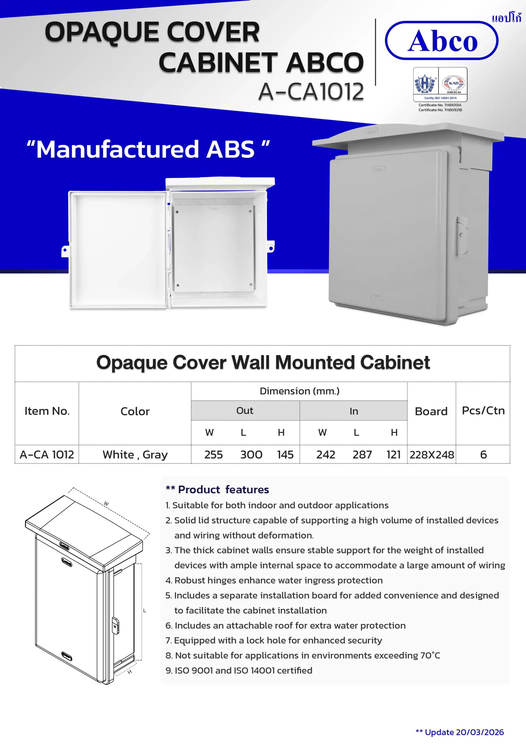 The Abco Opaque Cover Wall-Mounted Cabinet is engineered for both indoor and outdoor electrical device installations. Manufactured from ABS plastic, this cabinet includes a convenient installation board. Larger sizes come with a detachable roof and a lock hole for extra security.