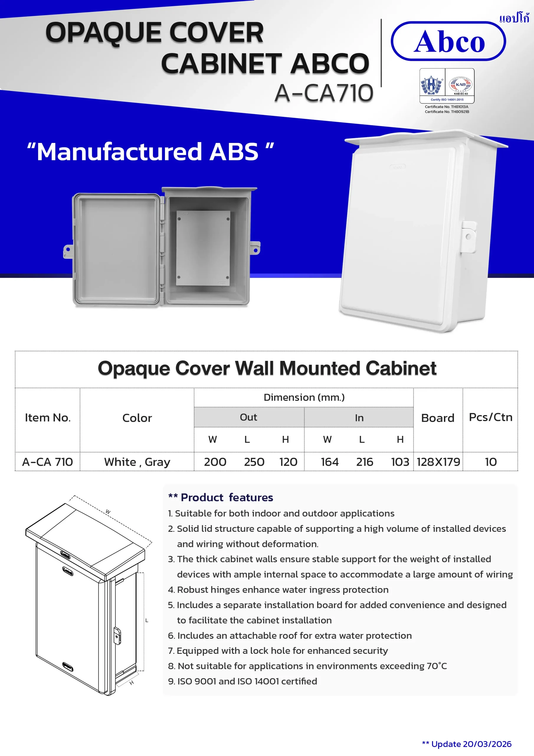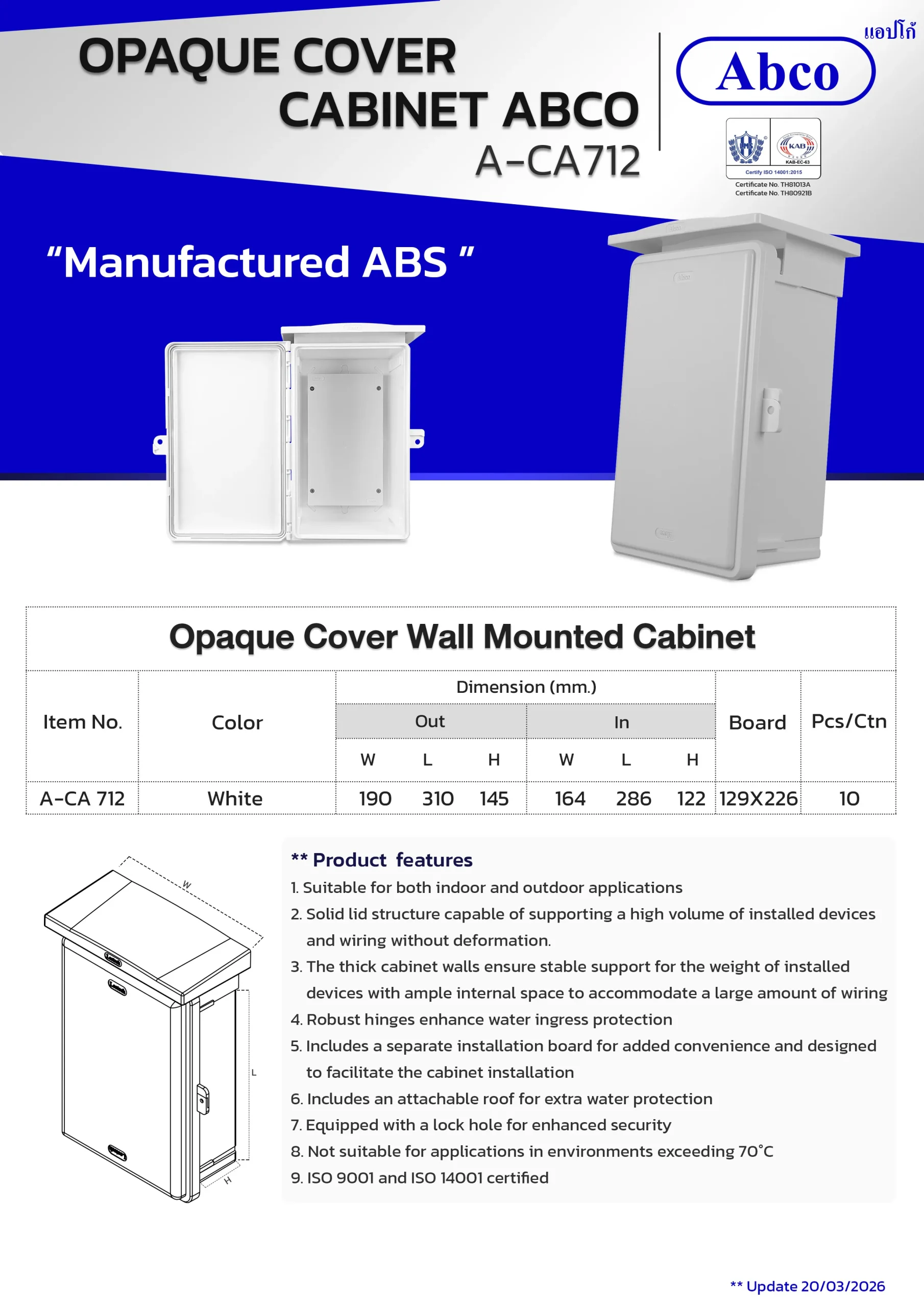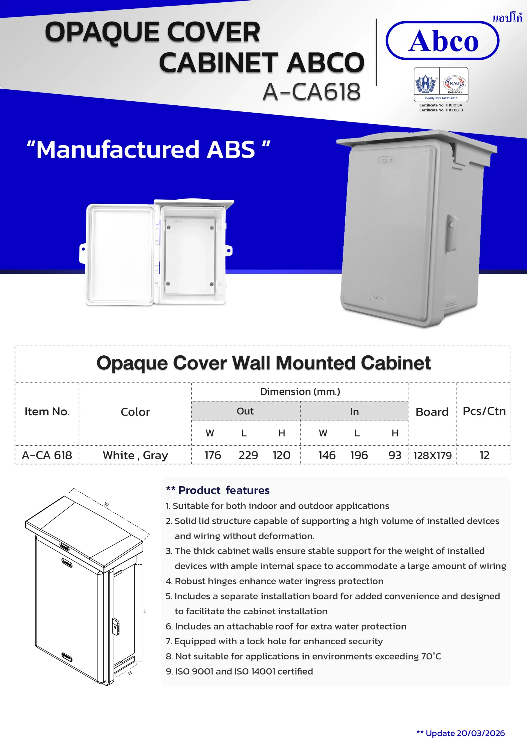 The Abco Opaque Cover Wall-Mounted Cabinet is engineered for both indoor and outdoor electrical device installations. Manufactured from ABS plastic, this cabinet includes a convenient installation board. Larger sizes come with a detachable roof and a lock hole for extra security.