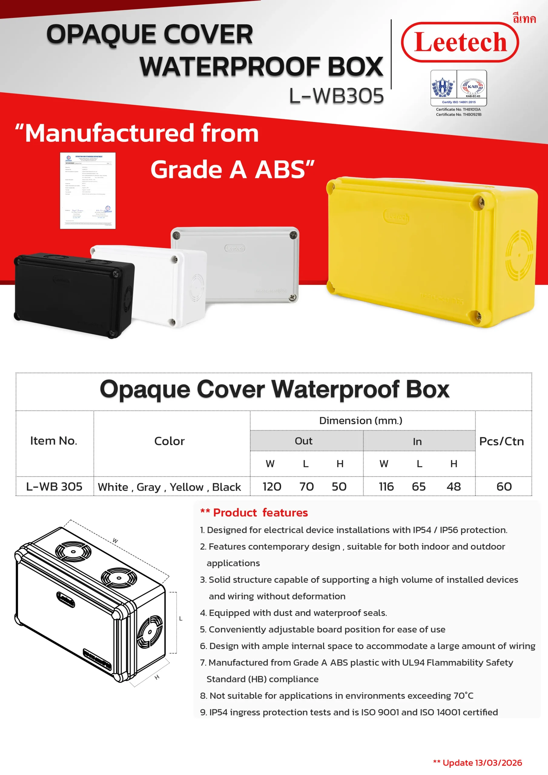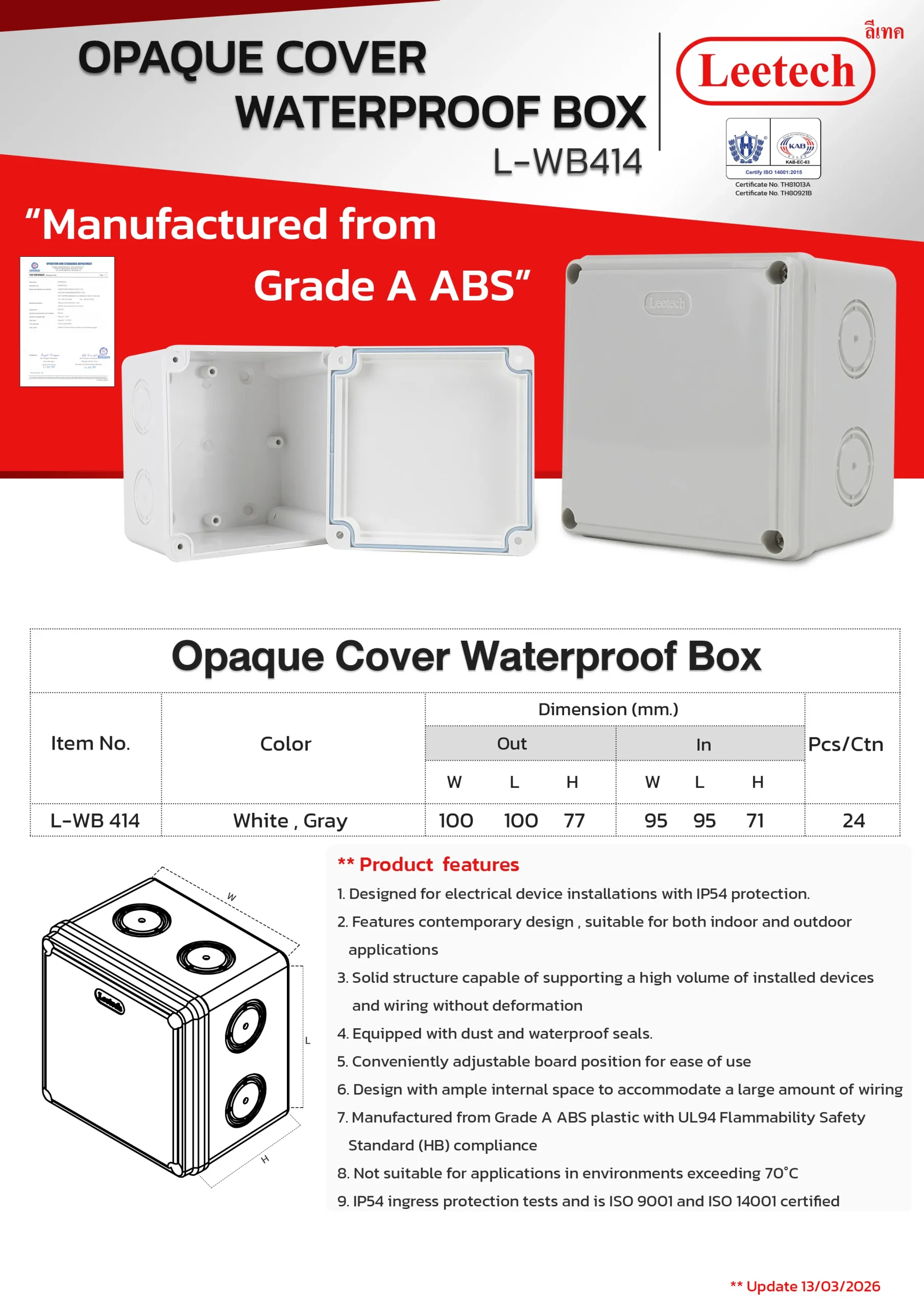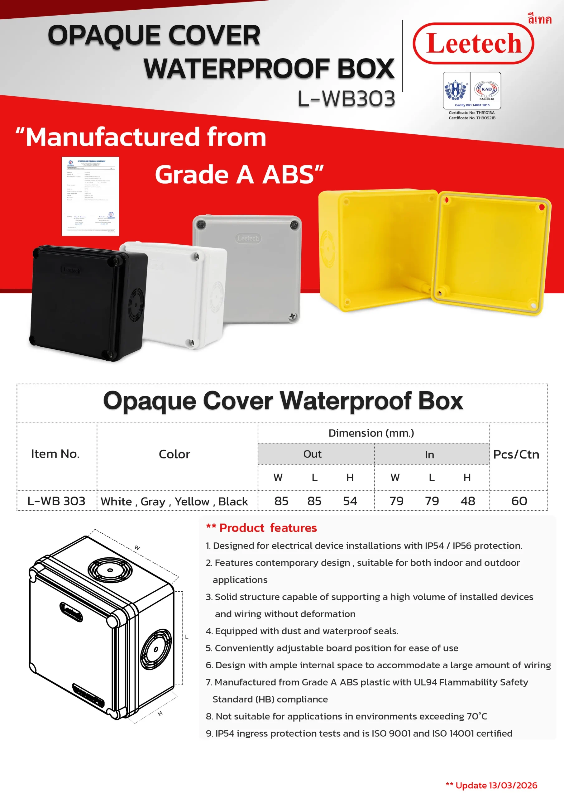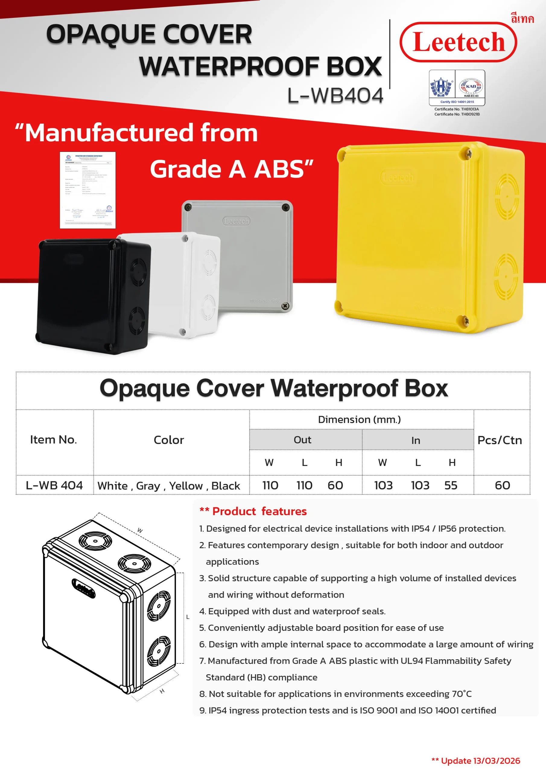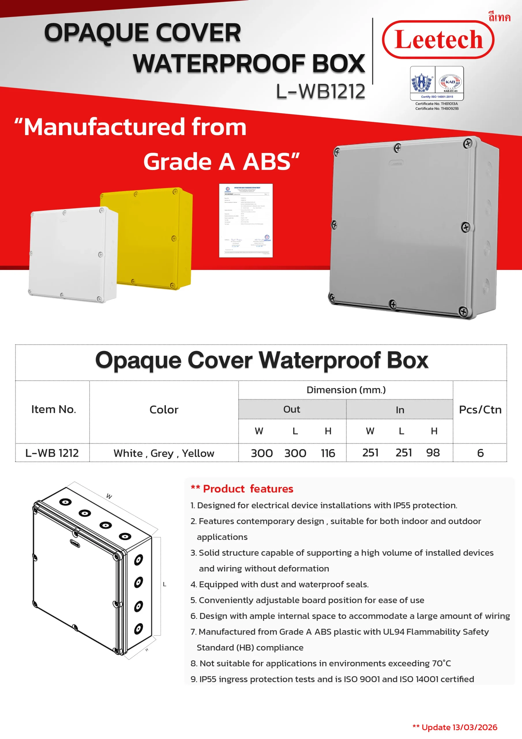 The Leetech Waterproof Box is designed for secure electrical device installations in both indoor and outdoor environments. Featuring water and dustproof seals, it meets IP54,IP55 and IP65 ratings for reliable protection. Manufactured from top-grade ABS plastic, the box offers high-impact resistance and stability to support installed devices. It is available in a variety of sizes and colors, allowing for options to fit different applications.