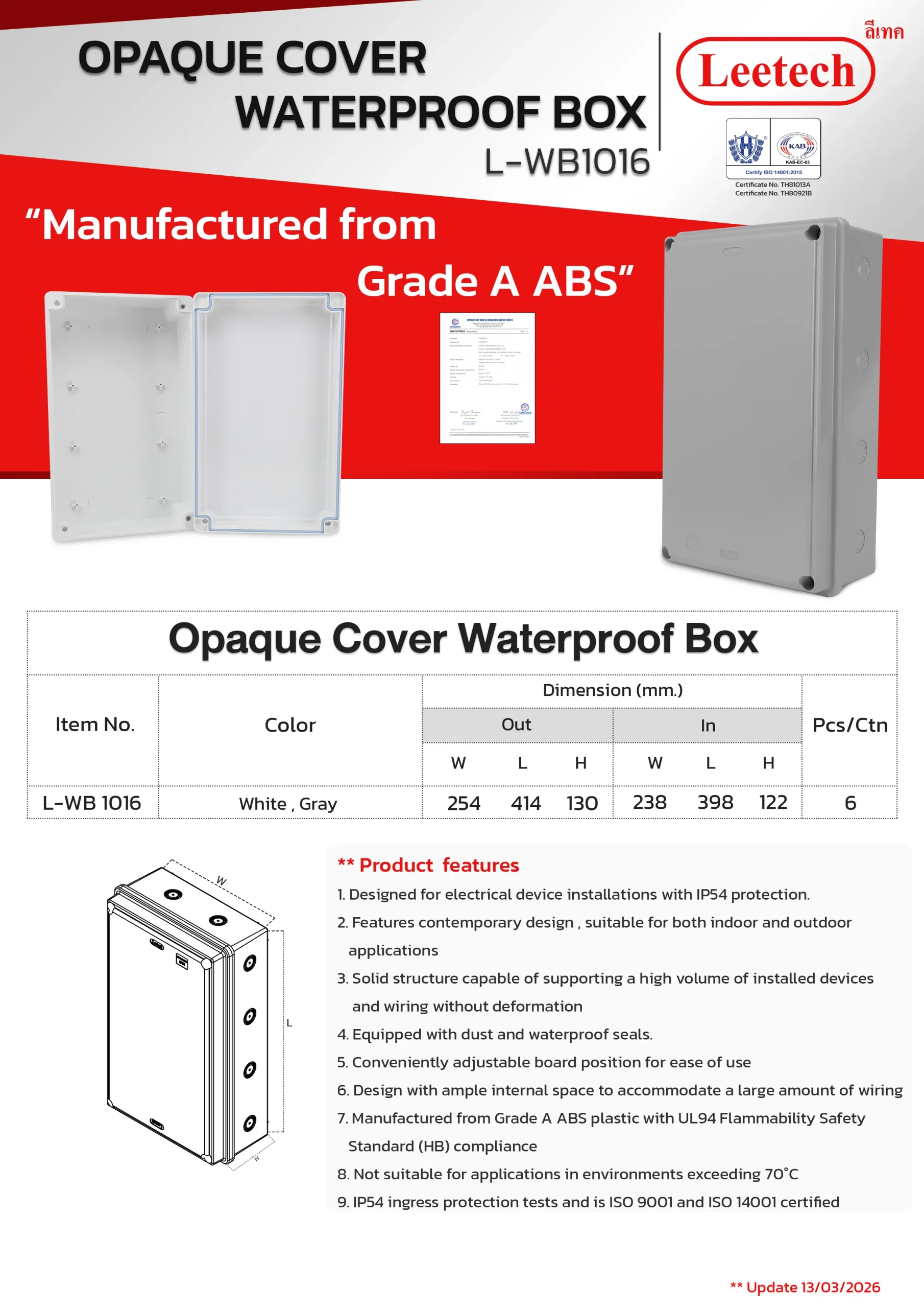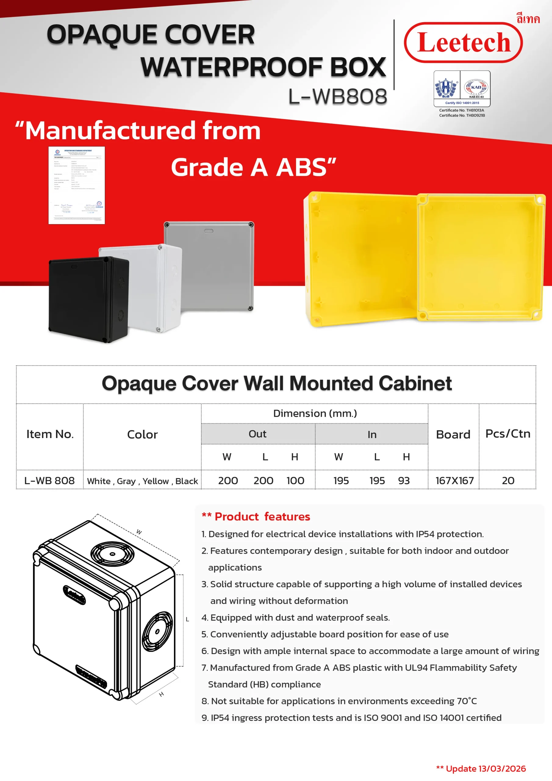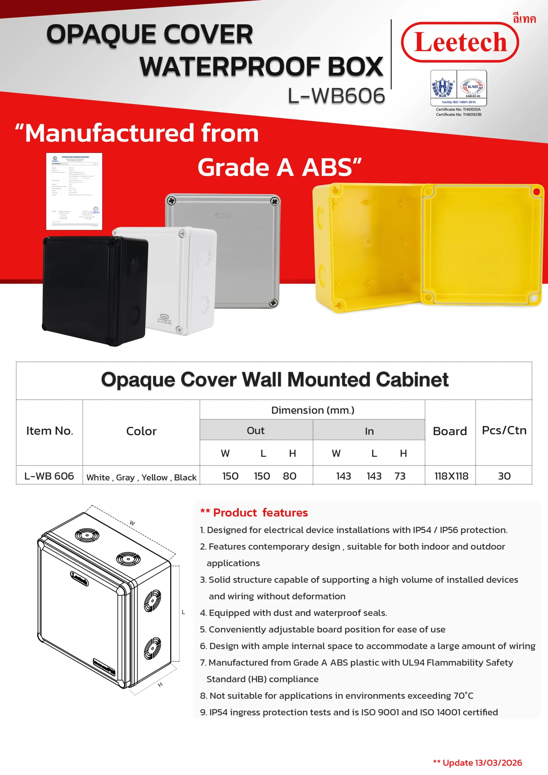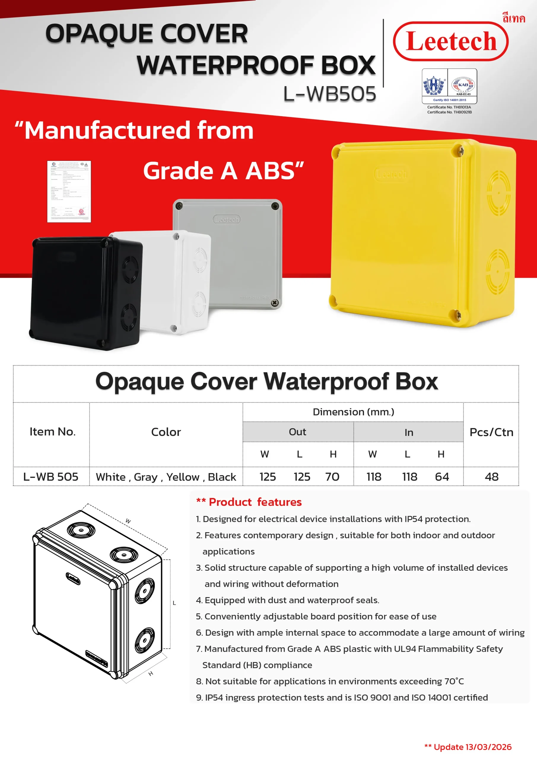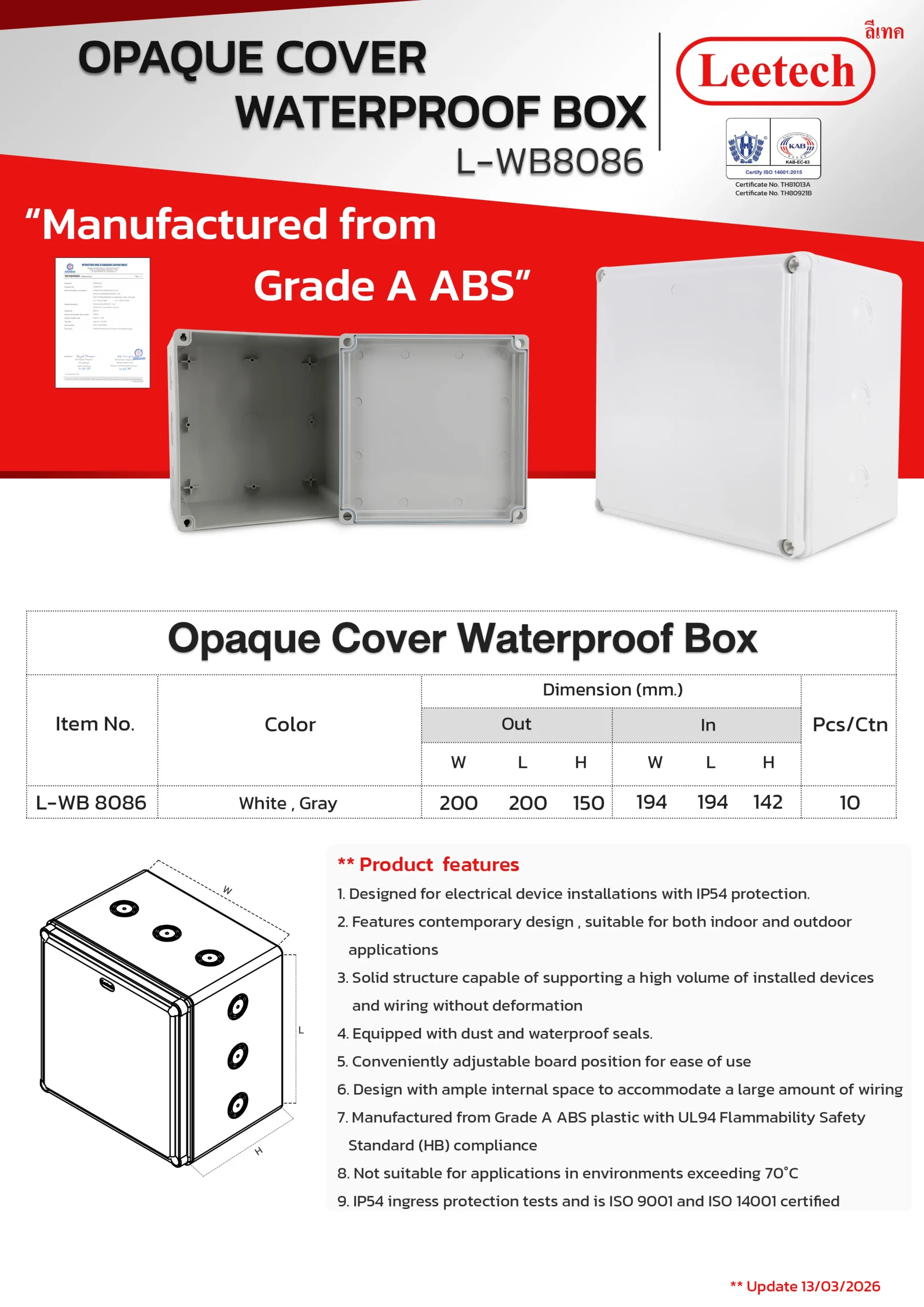 The Leetech Waterproof Box is designed for secure electrical device installations in both indoor and outdoor environments. Featuring water and dustproof seals, it meets IP54,IP55 and IP65 ratings for reliable protection. Manufactured from top-grade ABS plastic, the box offers high-impact resistance and stability to support installed devices. It is available in a variety of sizes and colors, allowing for options to fit different applications.