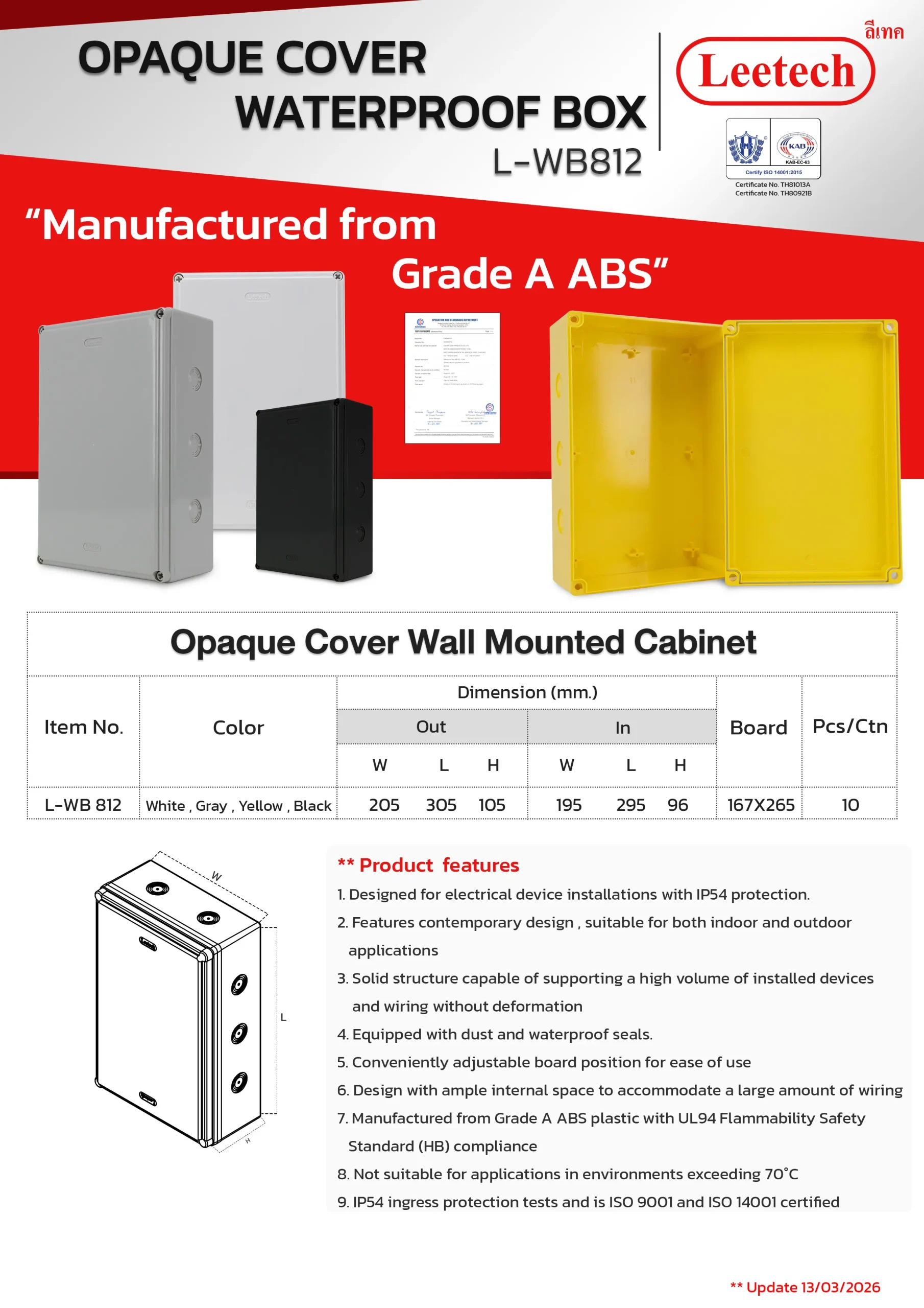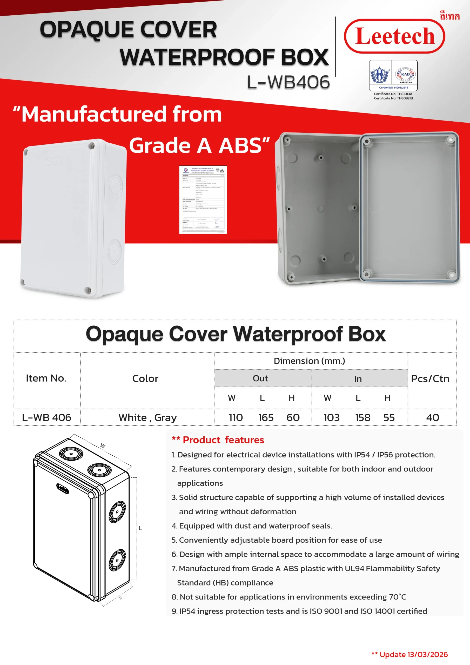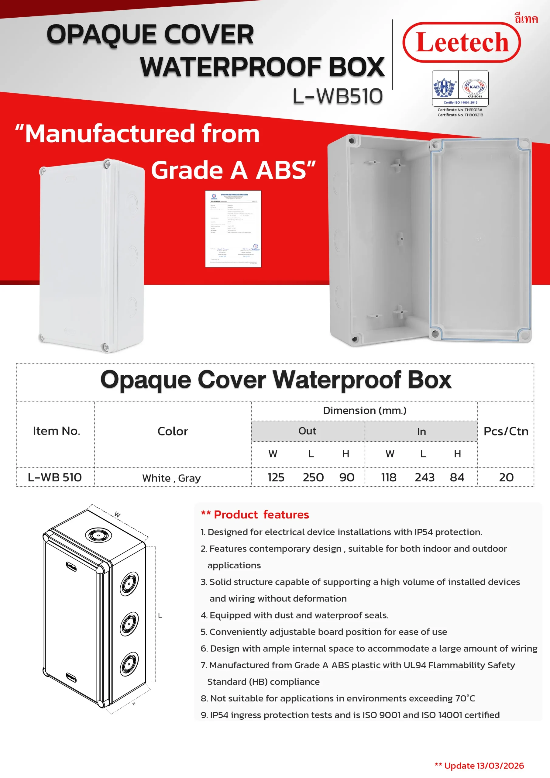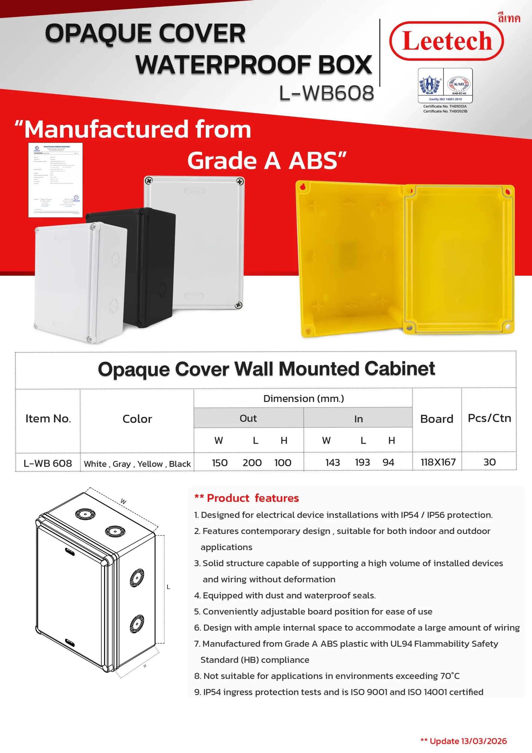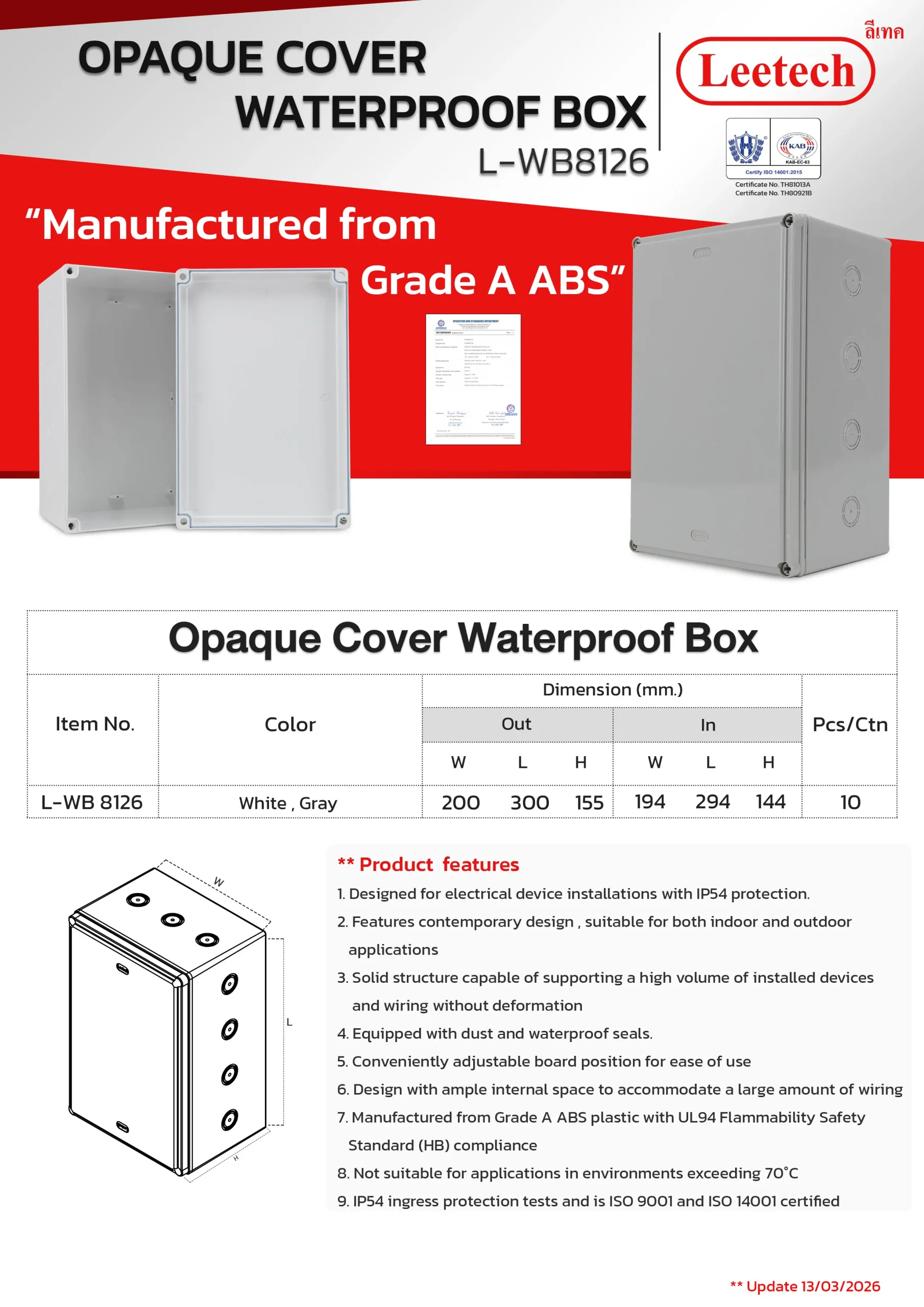 The Leetech Waterproof Box is designed for secure electrical device installations in both indoor and outdoor environments. Featuring water and dustproof seals, it meets IP54,IP55 and IP65 ratings for reliable protection. Manufactured from top-grade ABS plastic, the box offers high-impact resistance and stability to support installed devices. It is available in a variety of sizes and colors, allowing for options to fit different applications.