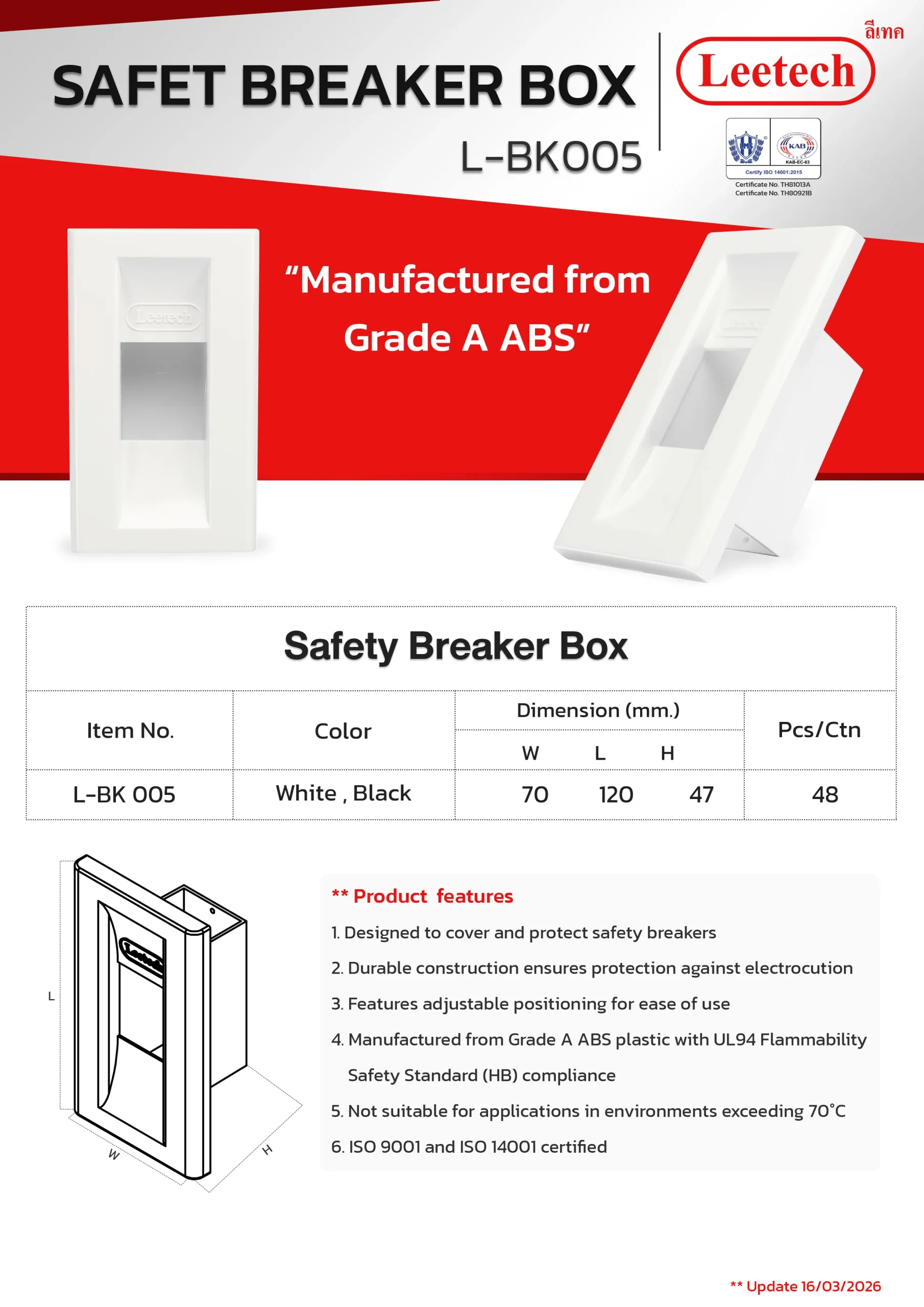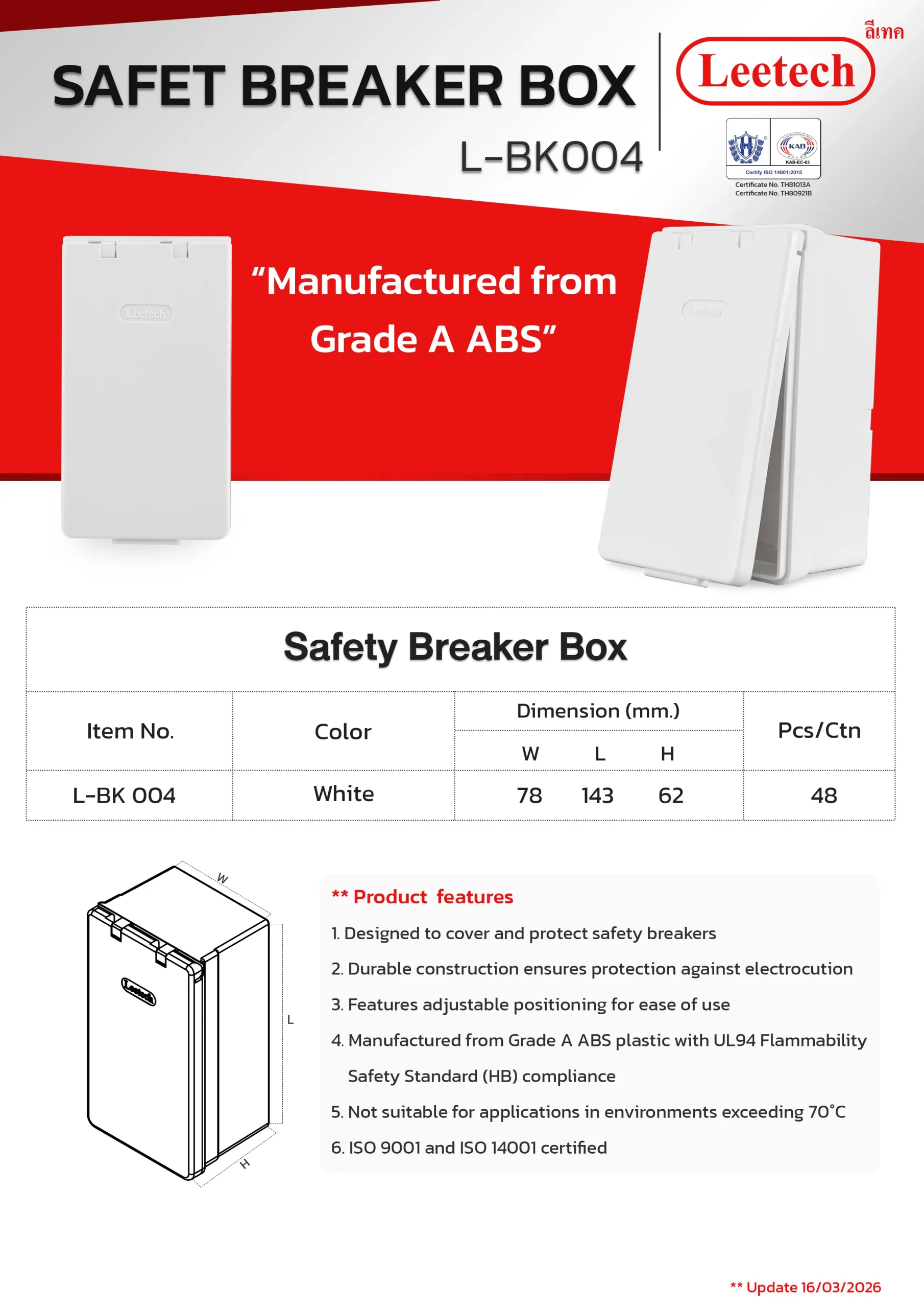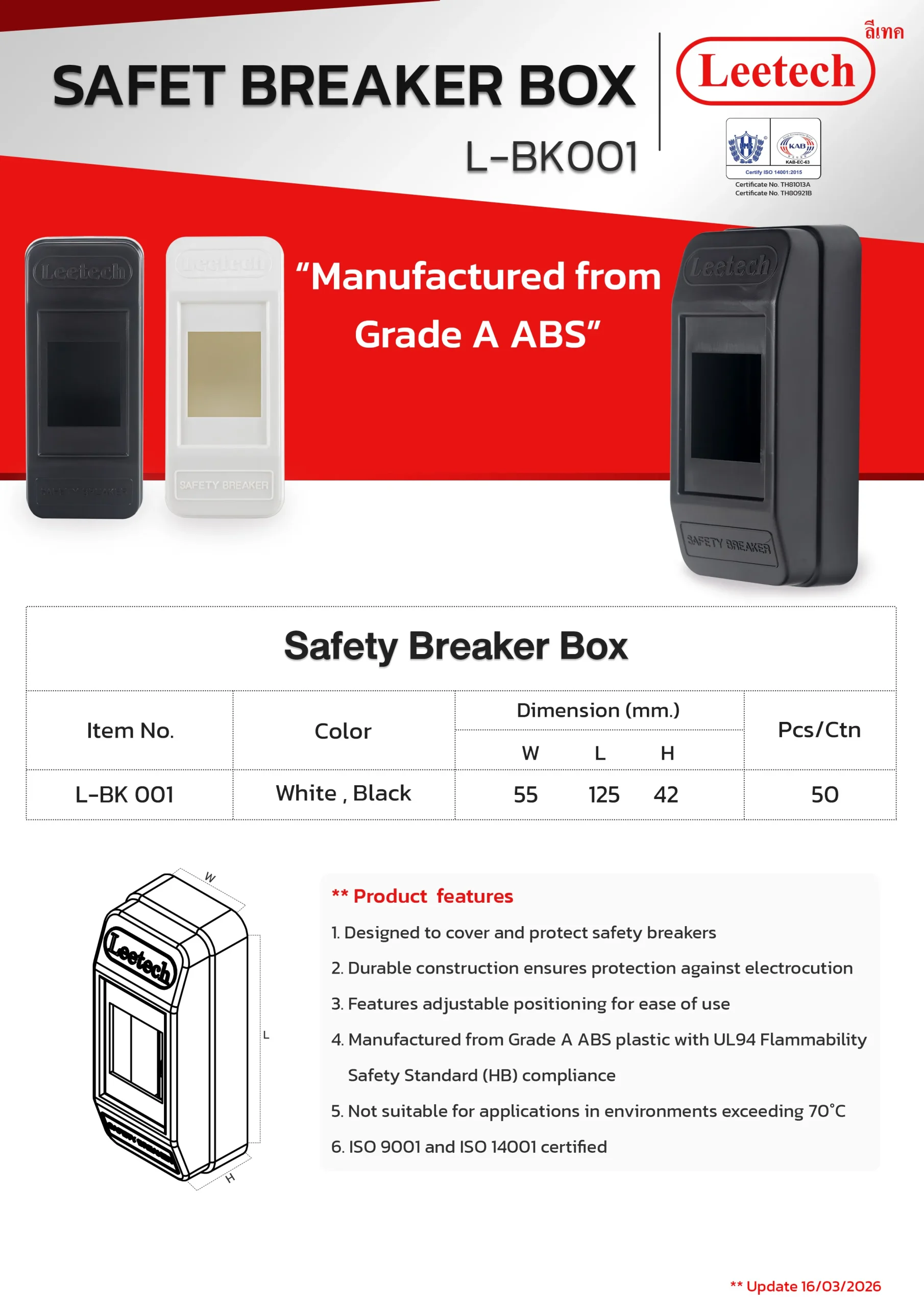 The Leetech Breaker Cover BK is designed for the installation of safety breaker devices. It offers high durability and secure protection for electrical current contacts. Constructed from top-grade ABS plastic, this cover ensures reliable and long-lasting performance.