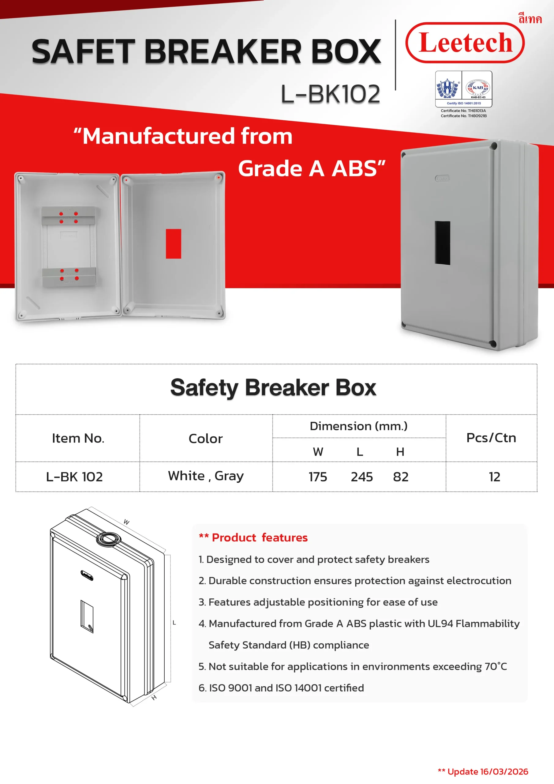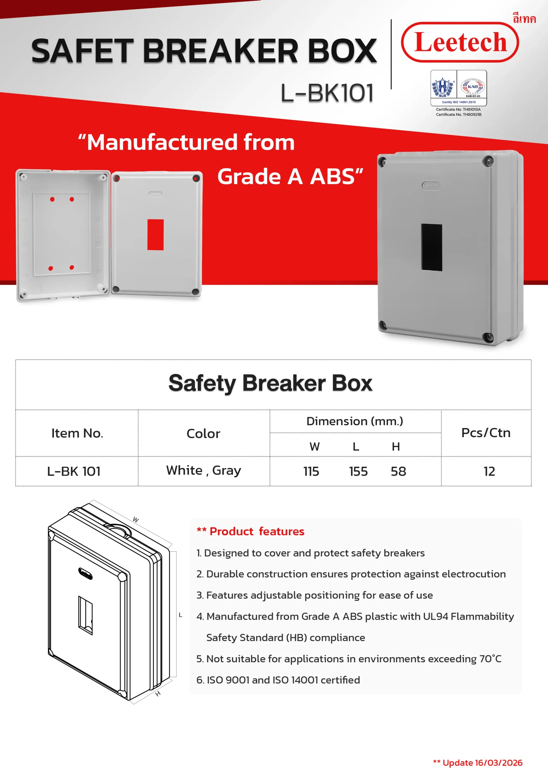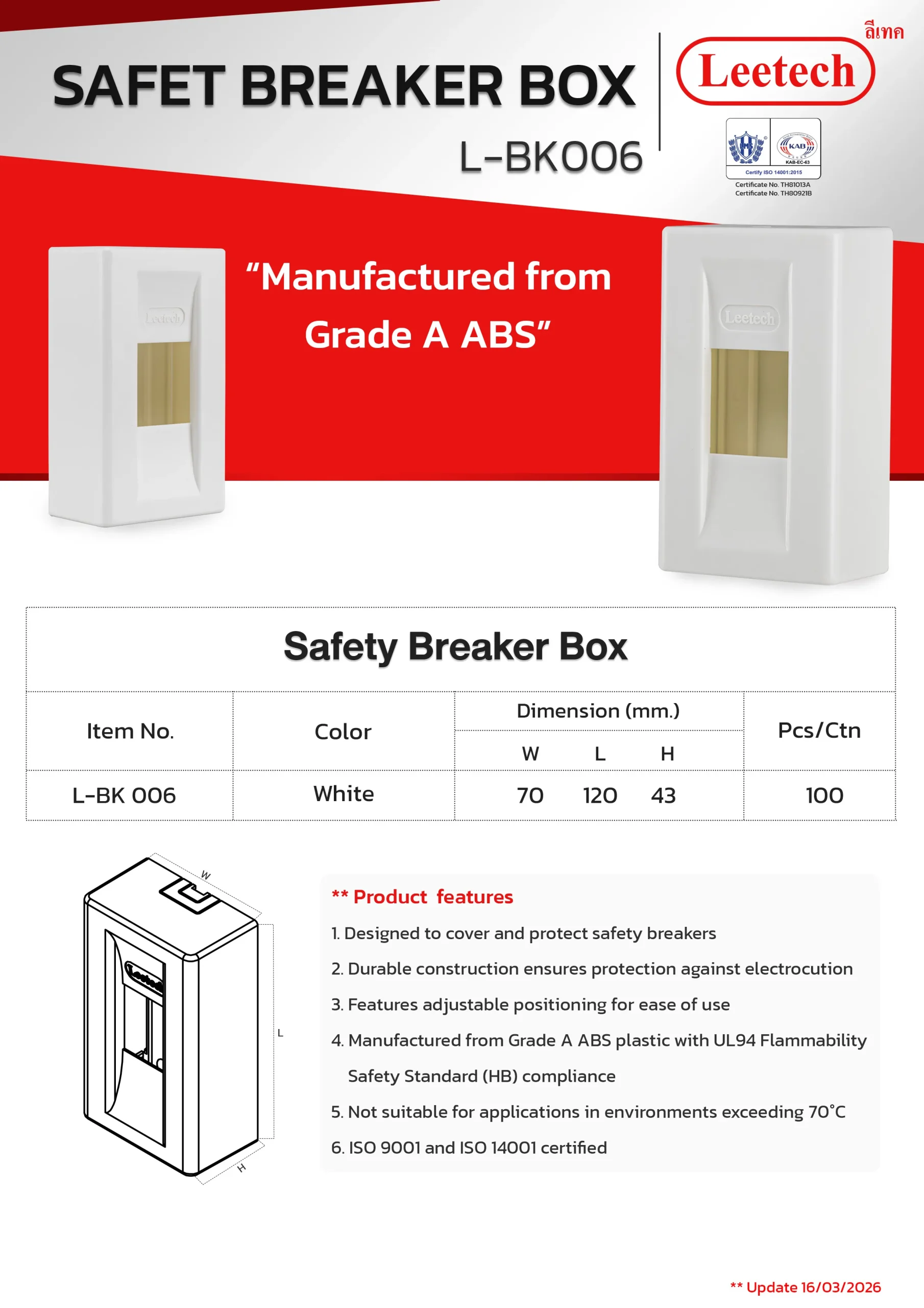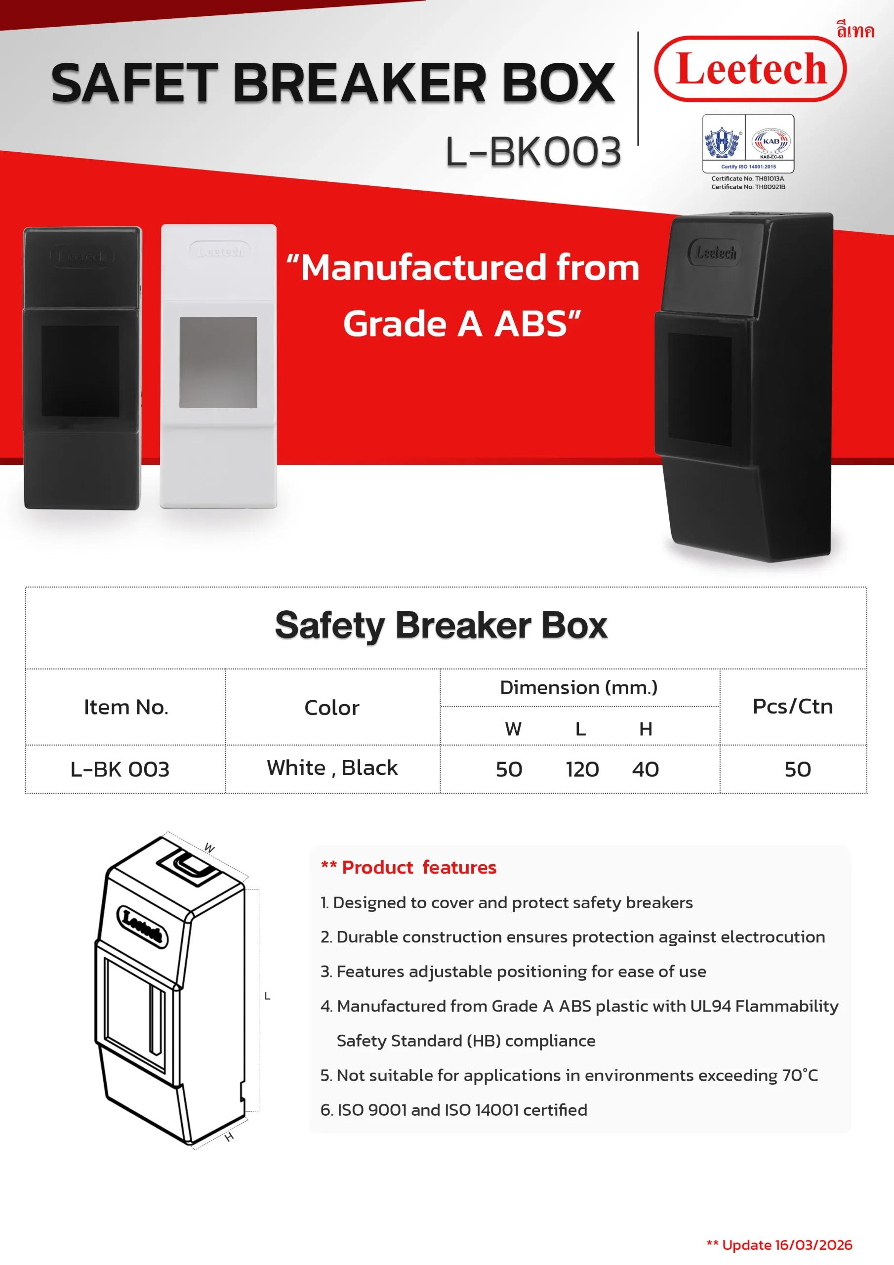 The Leetech Breaker Cover BK is designed for the installation of safety breaker devices. It offers high durability and secure protection for electrical current contacts. Constructed from top-grade ABS plastic, this cover ensures reliable and long-lasting performance.