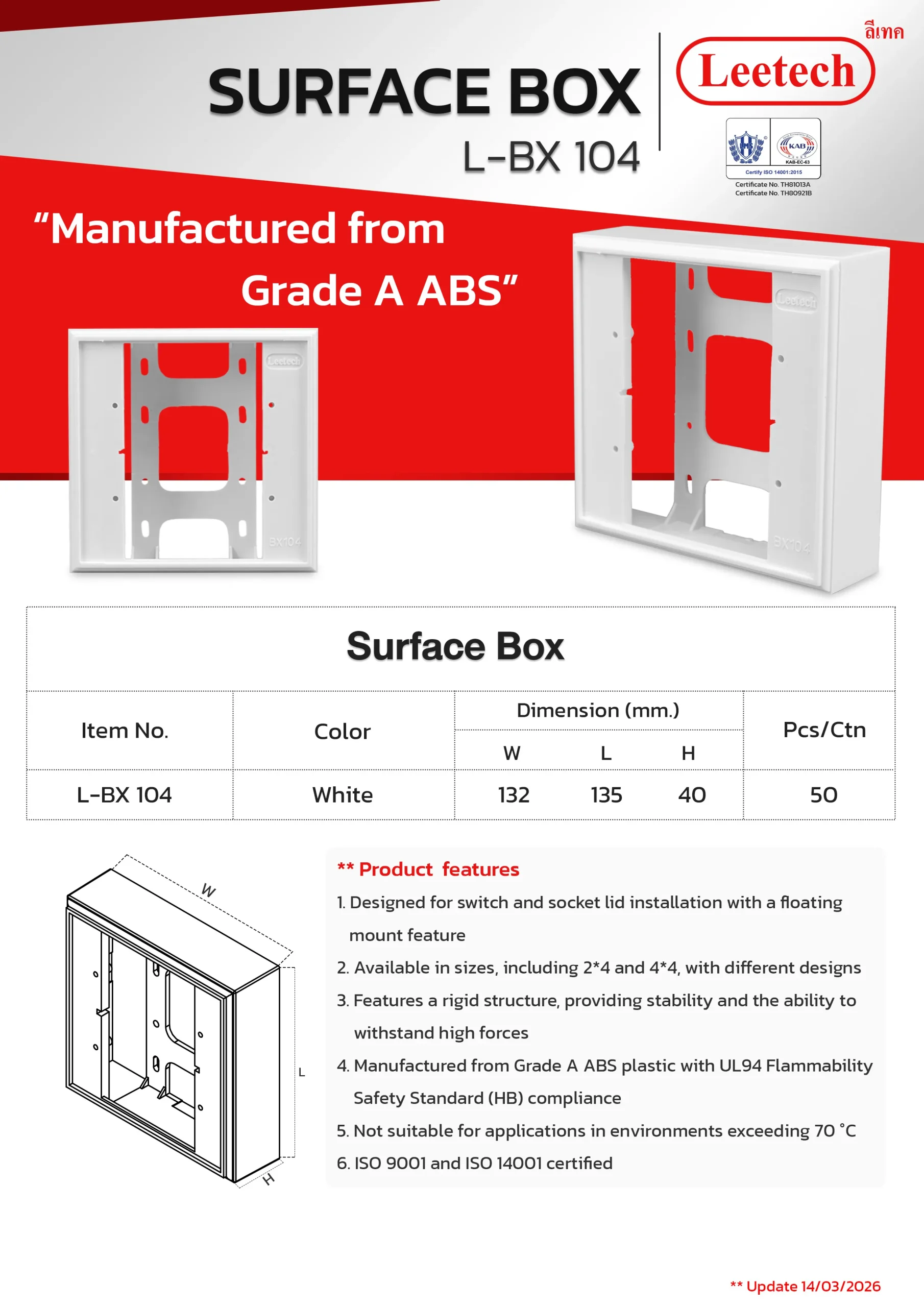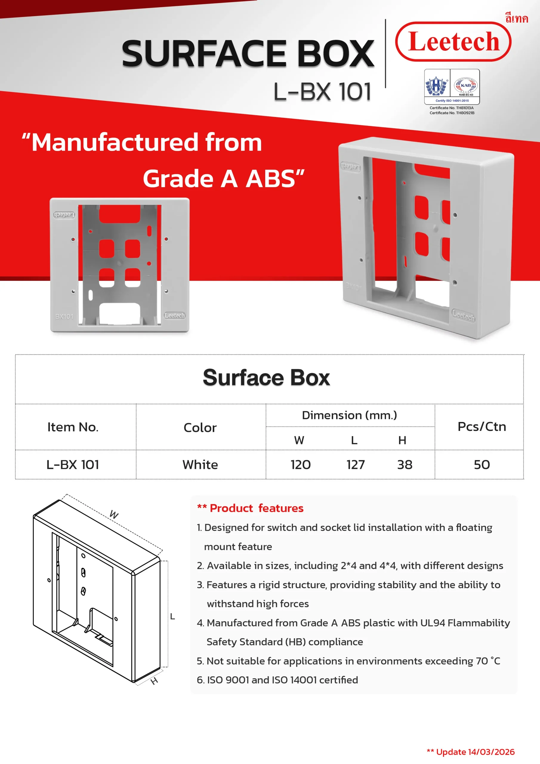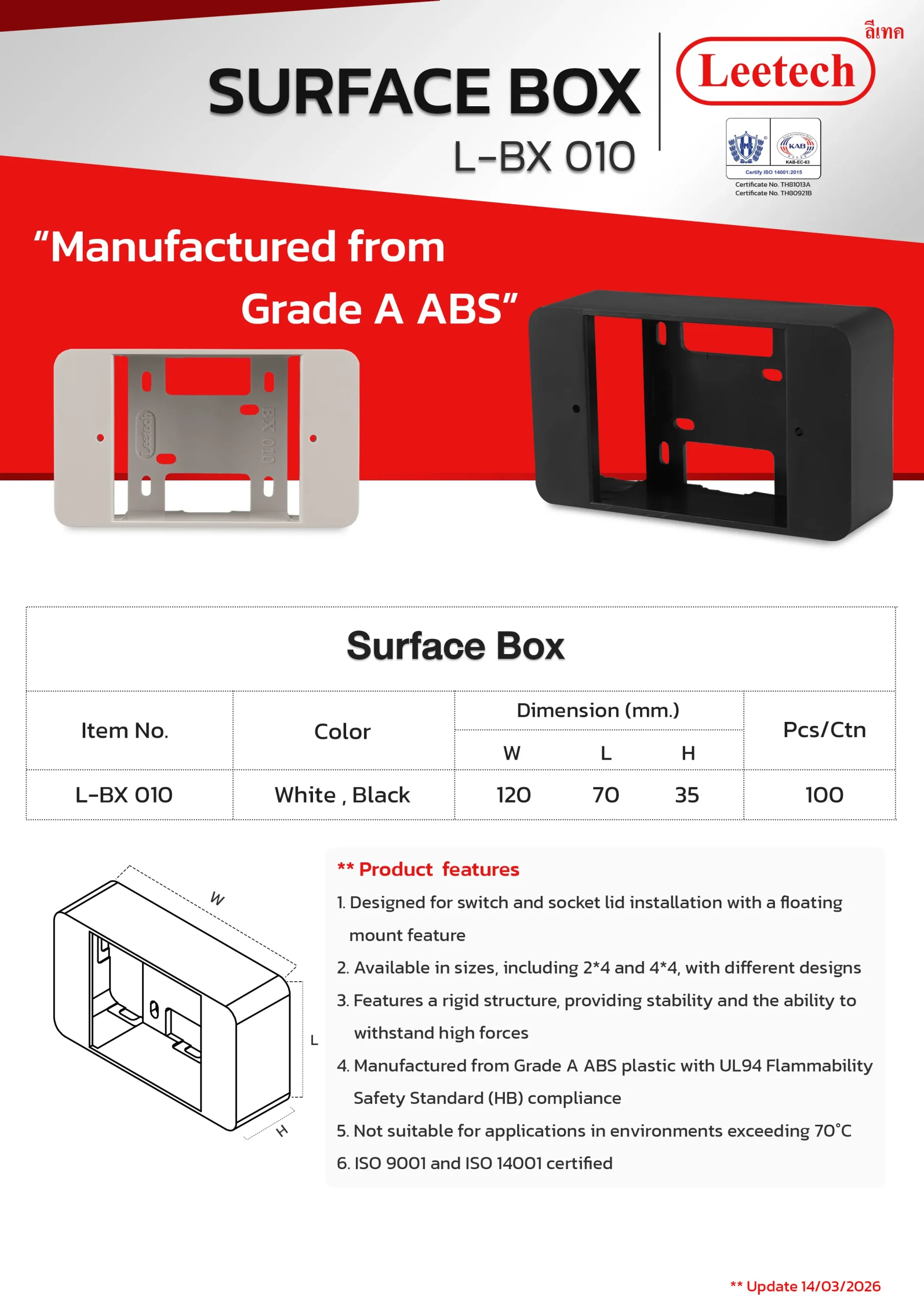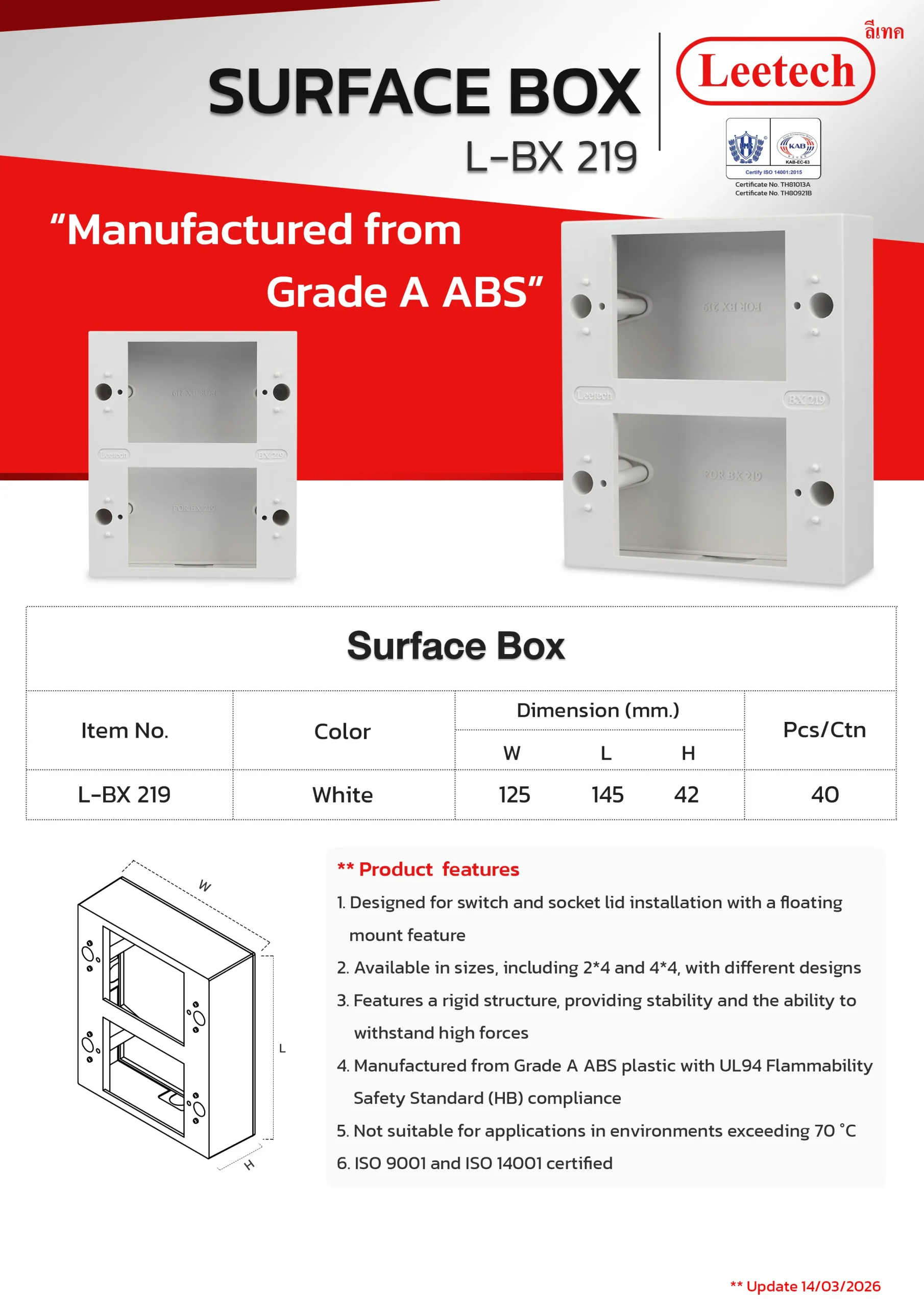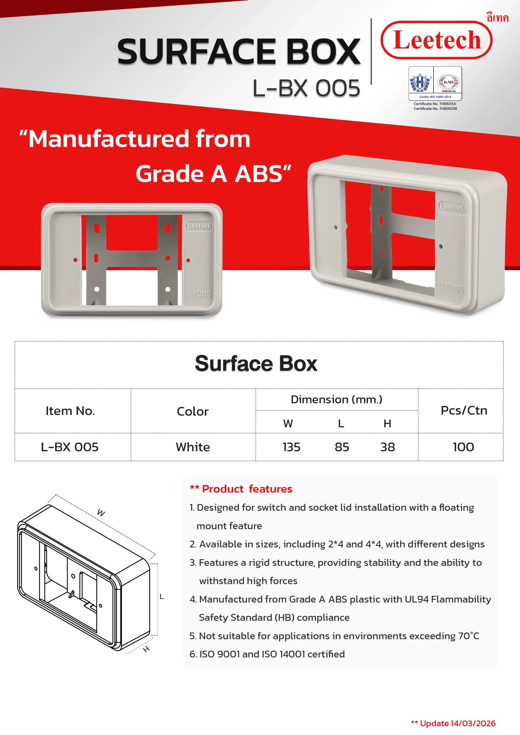 The Leetech Surface Box is designed for switch and socket lid installation with a floating mount feature. It features a rigid structure, providing stability and the ability to withstand high forces and is manufactured from top-grade ABS. Several sizes, including 2*4 and 4*4, with different designs are available to suit the applications.
