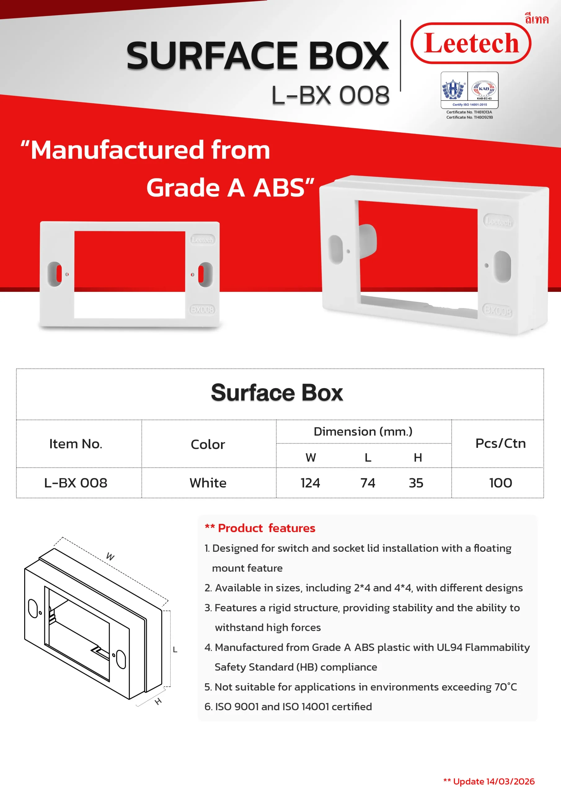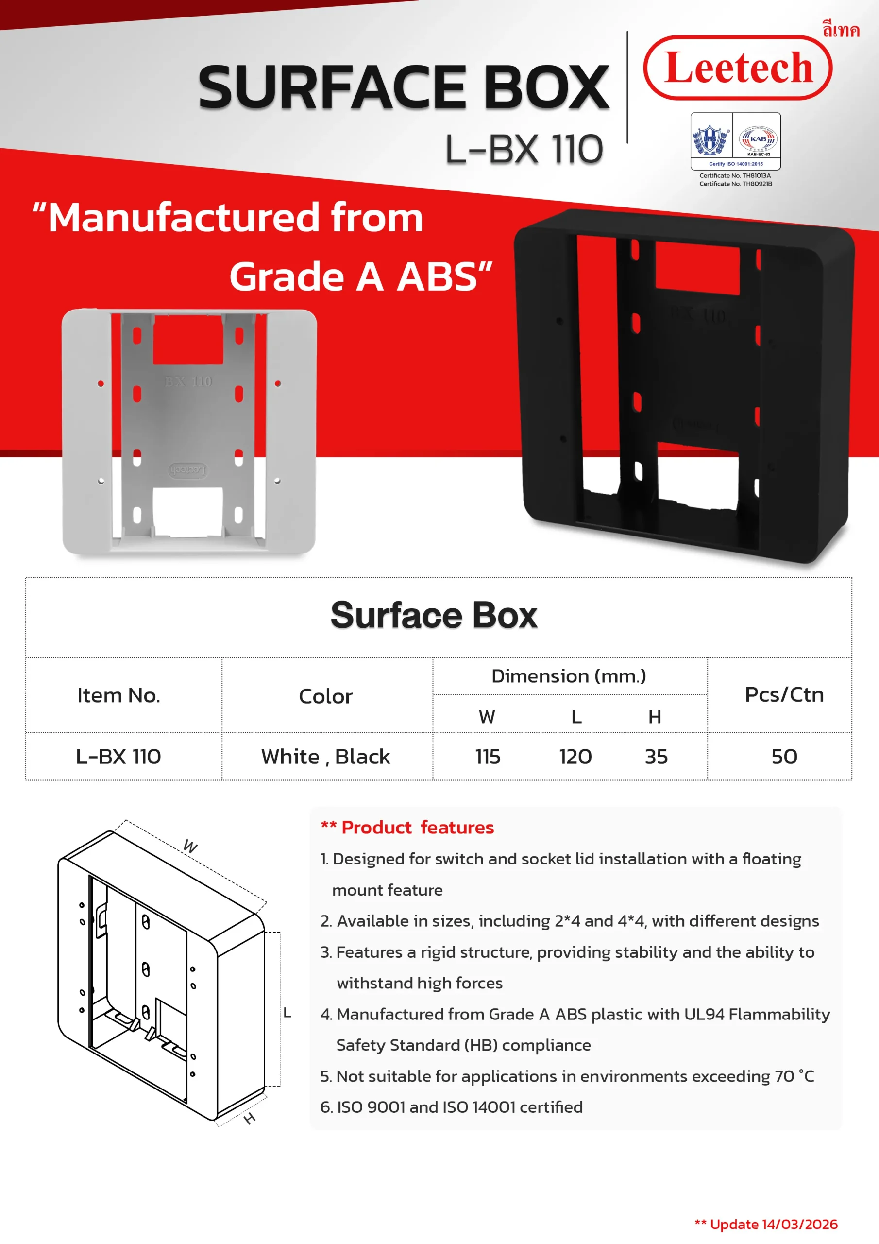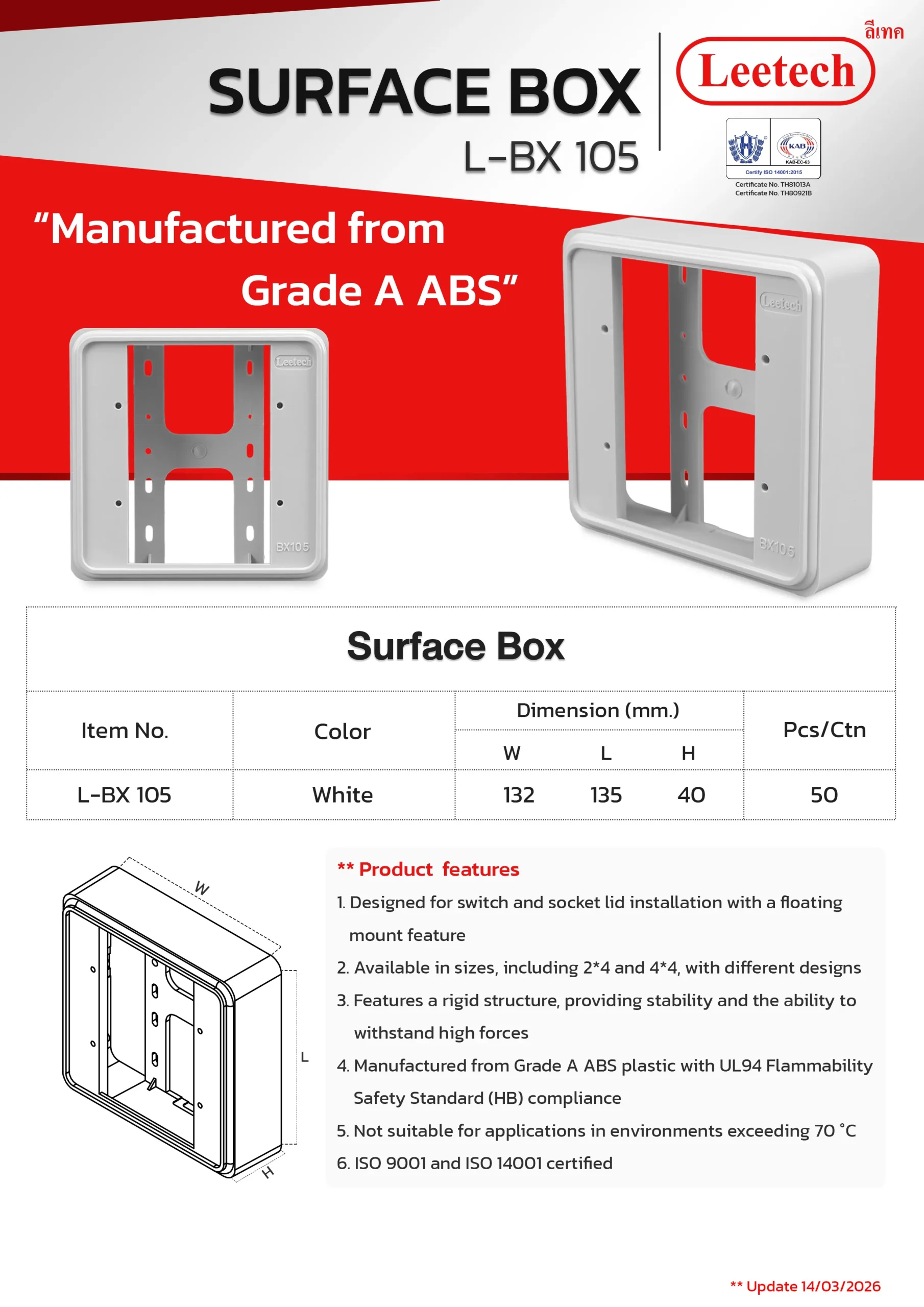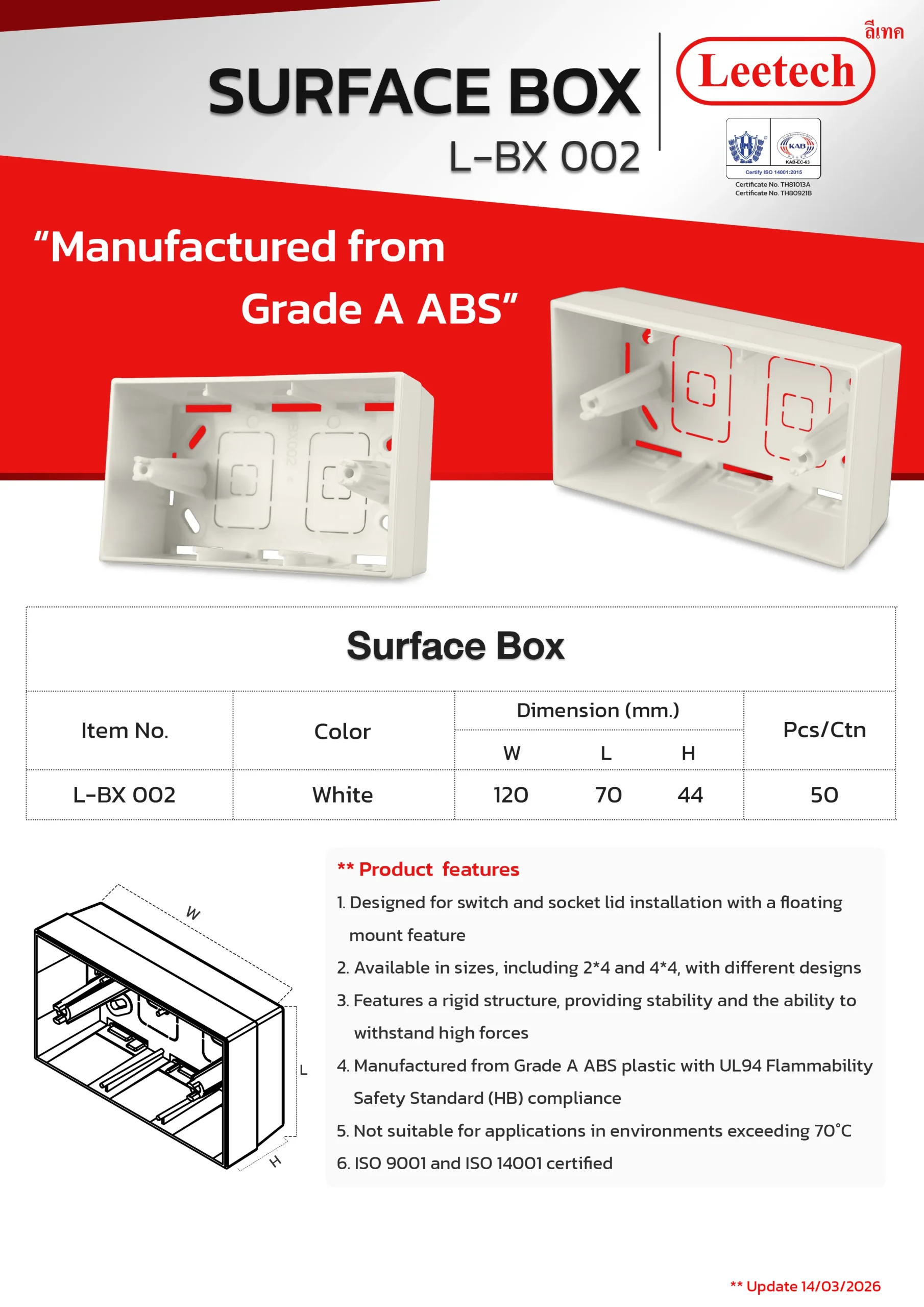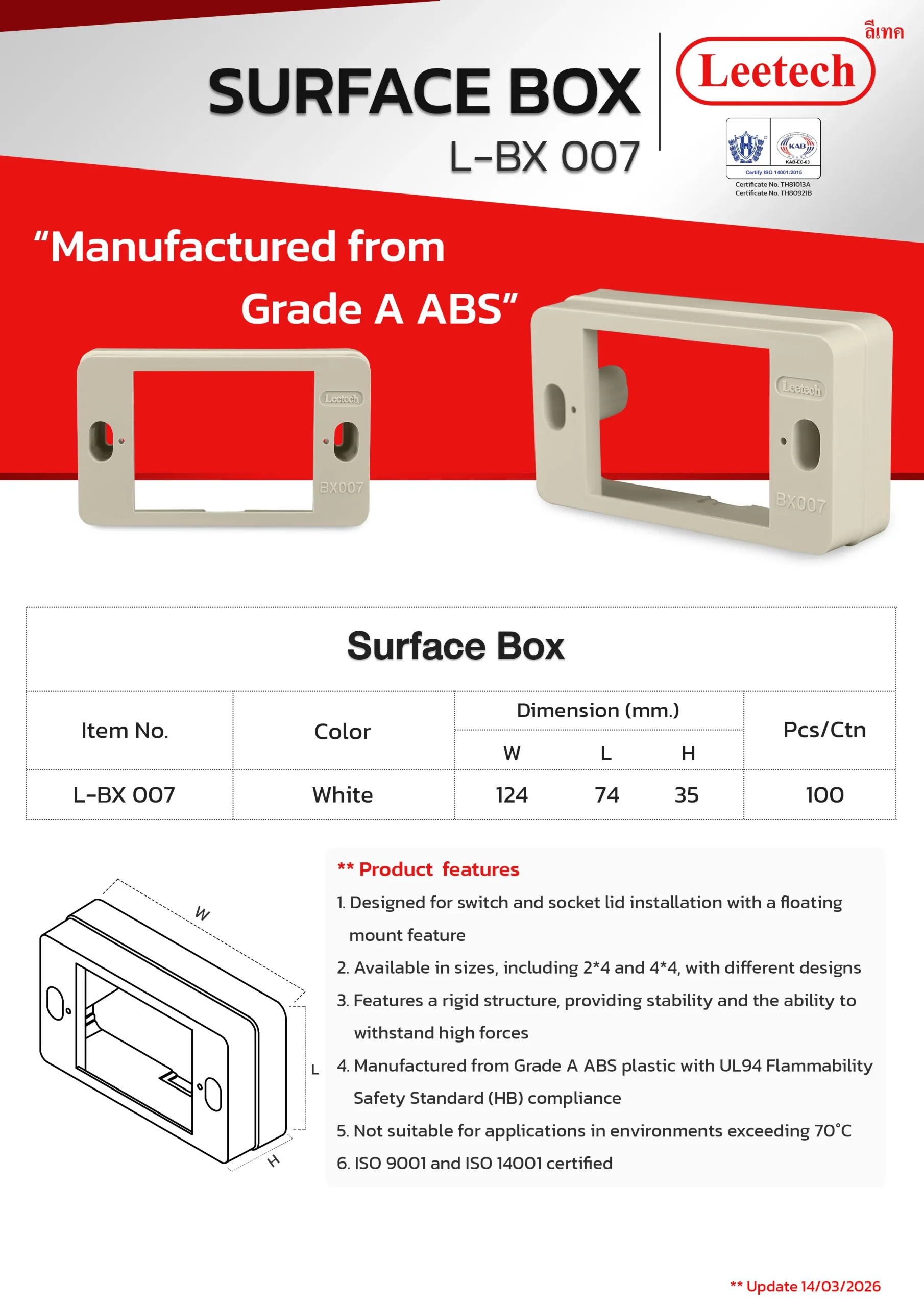 The Leetech Surface Box is designed for switch and socket lid installation with a floating mount feature. It features a rigid structure, providing stability and the ability to withstand high forces and is manufactured from top-grade ABS. Several sizes, including 2*4 and 4*4, with different designs are available to suit the applications.