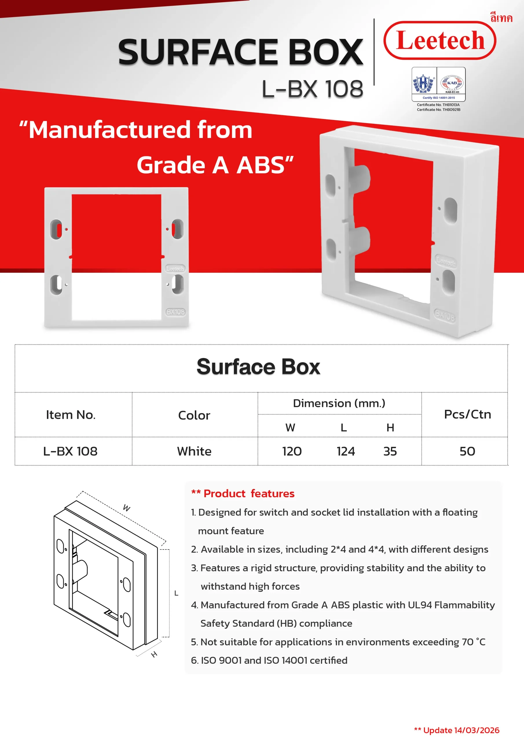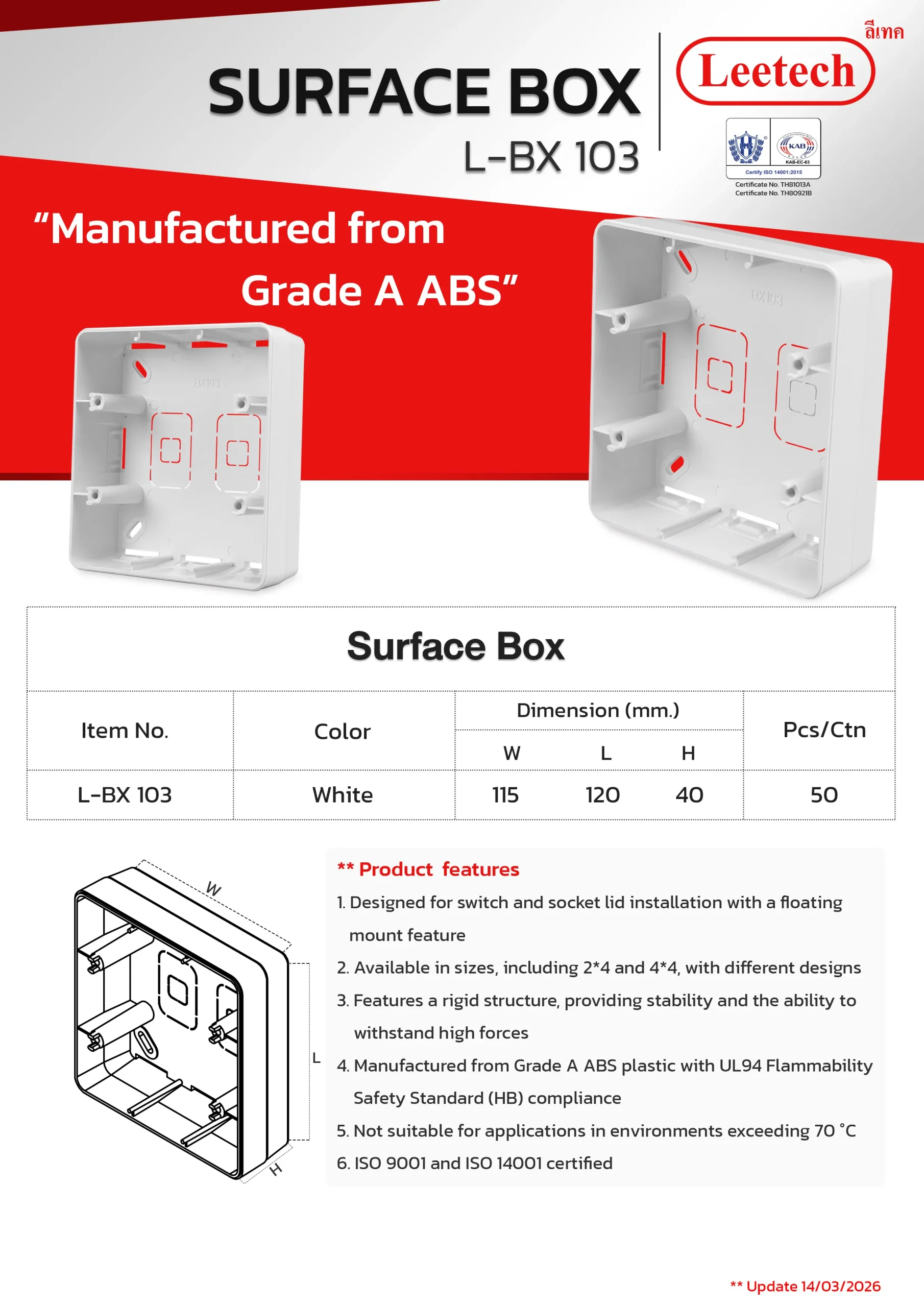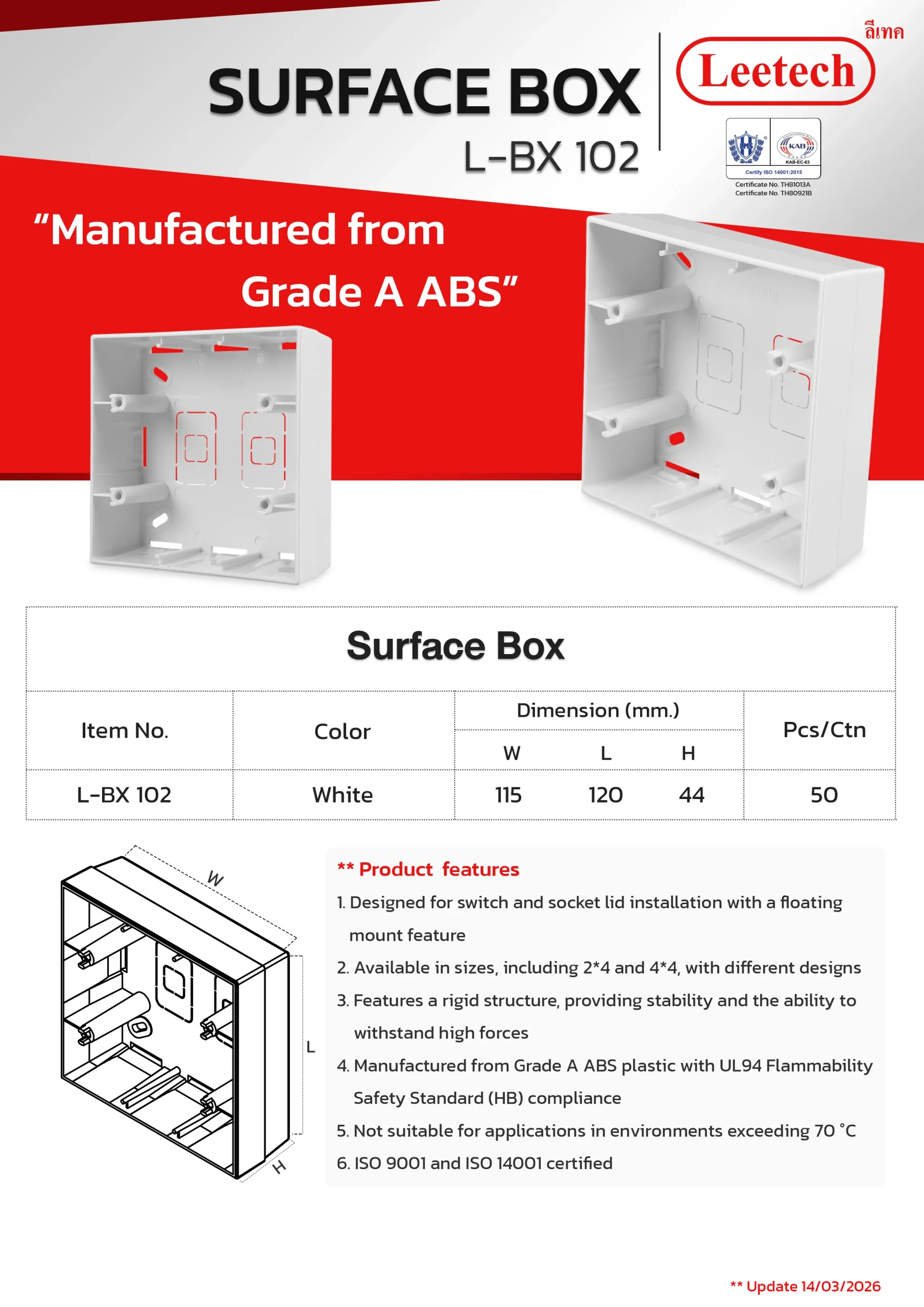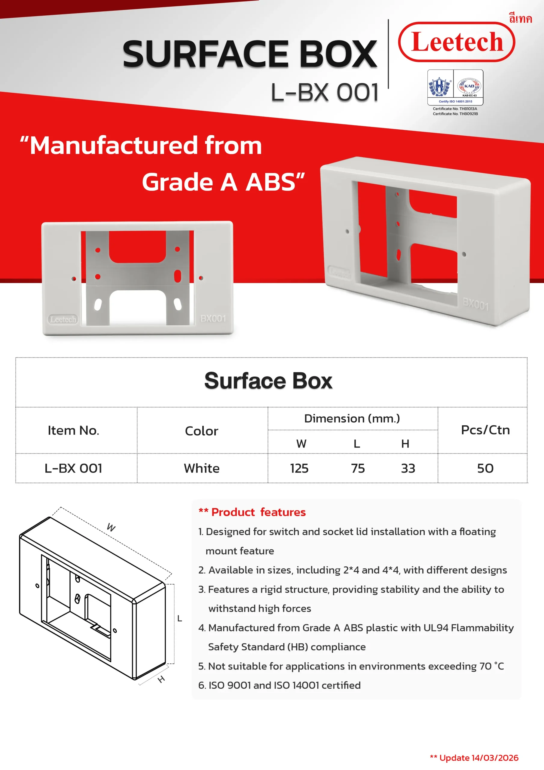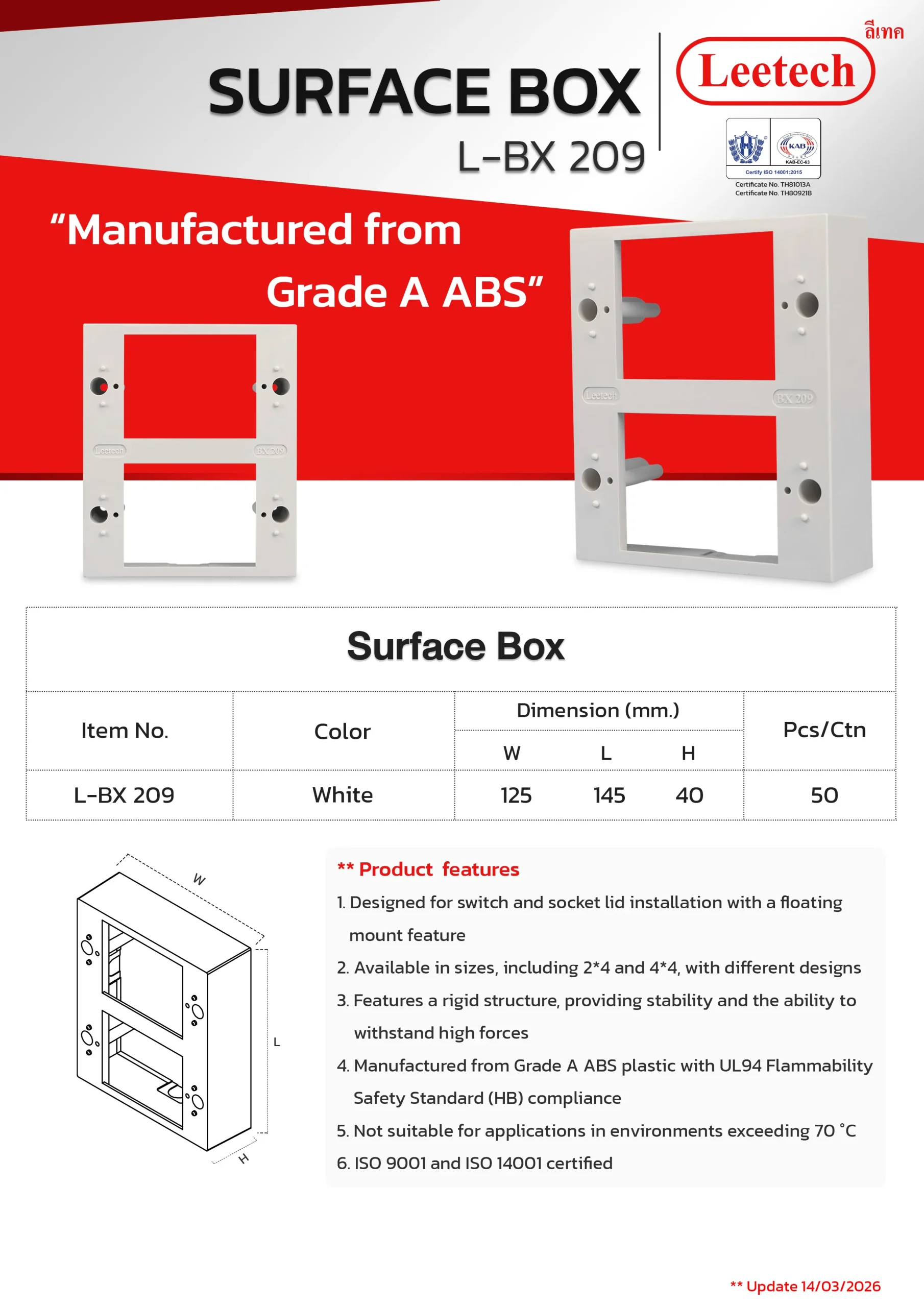 The Leetech Surface Box is designed for switch and socket lid installation with a floating mount feature. It features a rigid structure, providing stability and the ability to withstand high forces and is manufactured from top-grade ABS. Several sizes, including 2*4 and 4*4, with different designs are available to suit the applications.