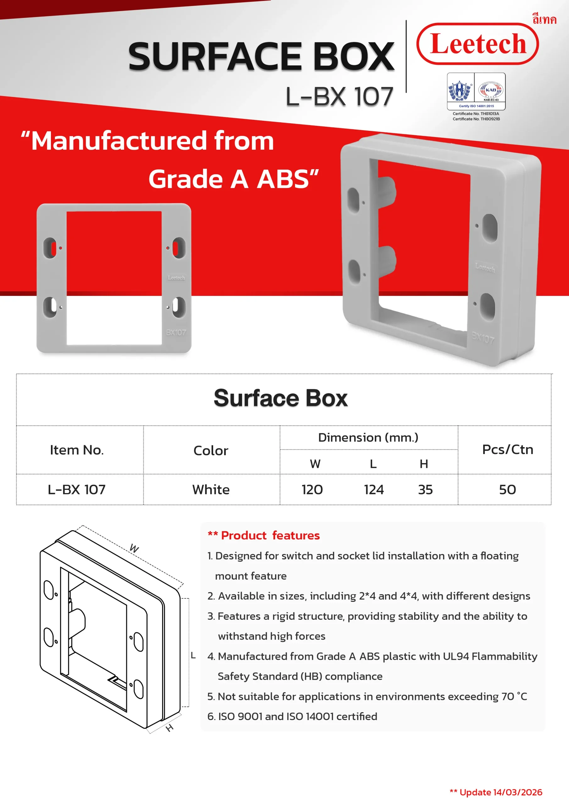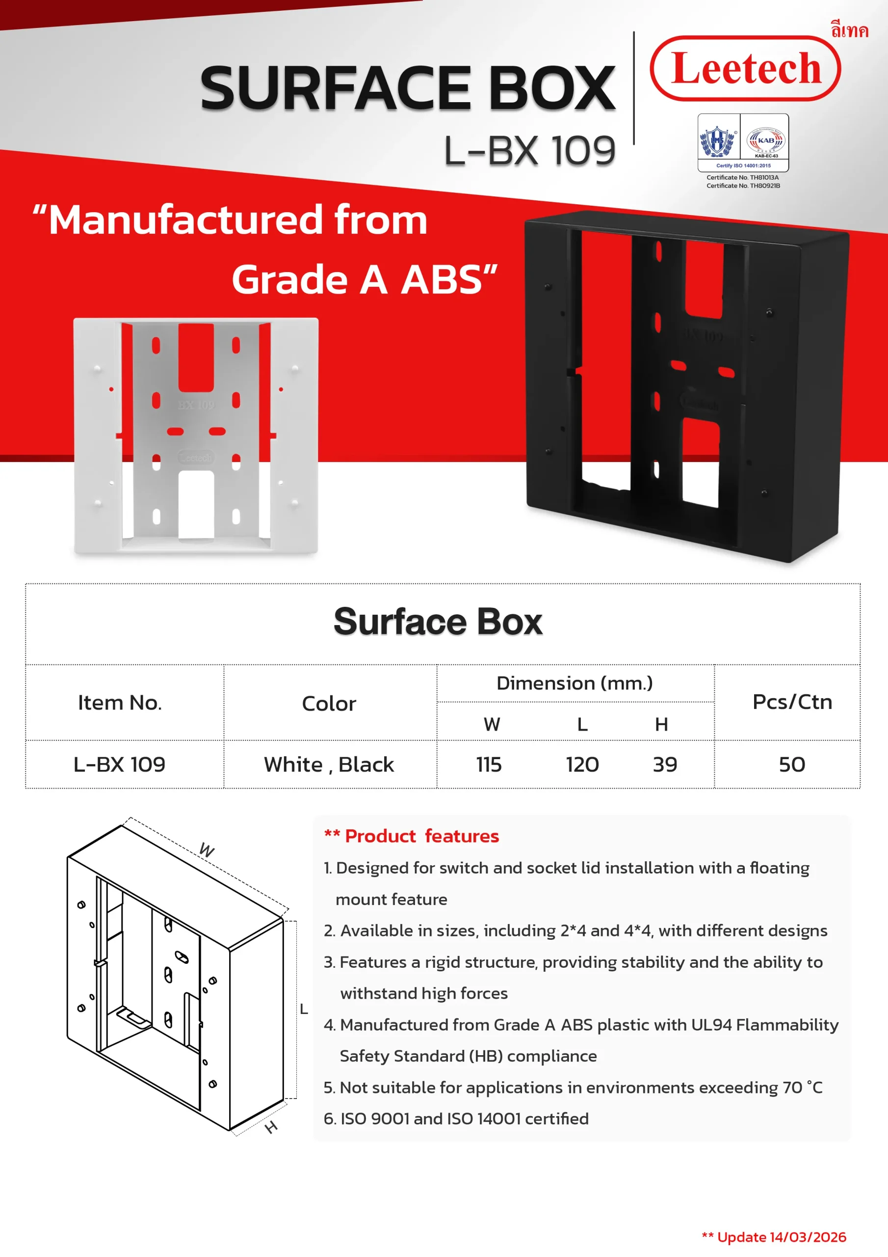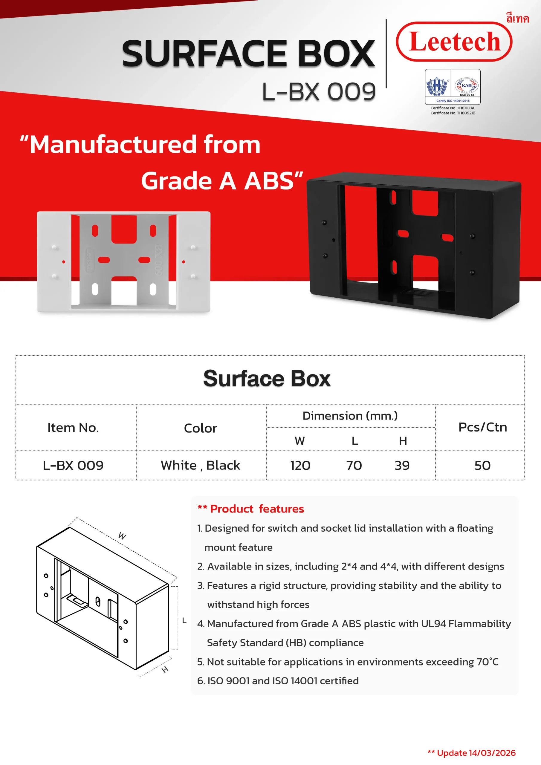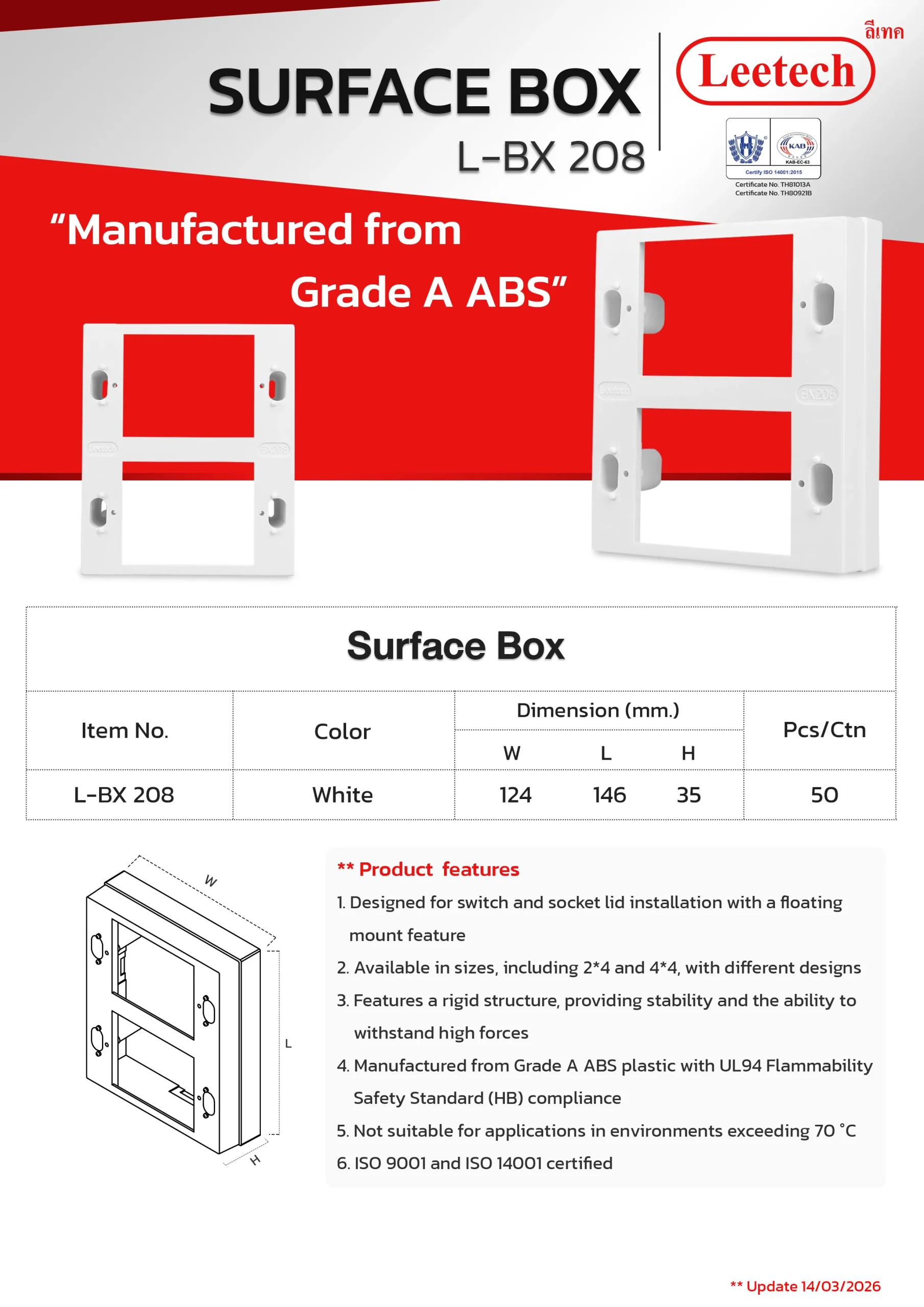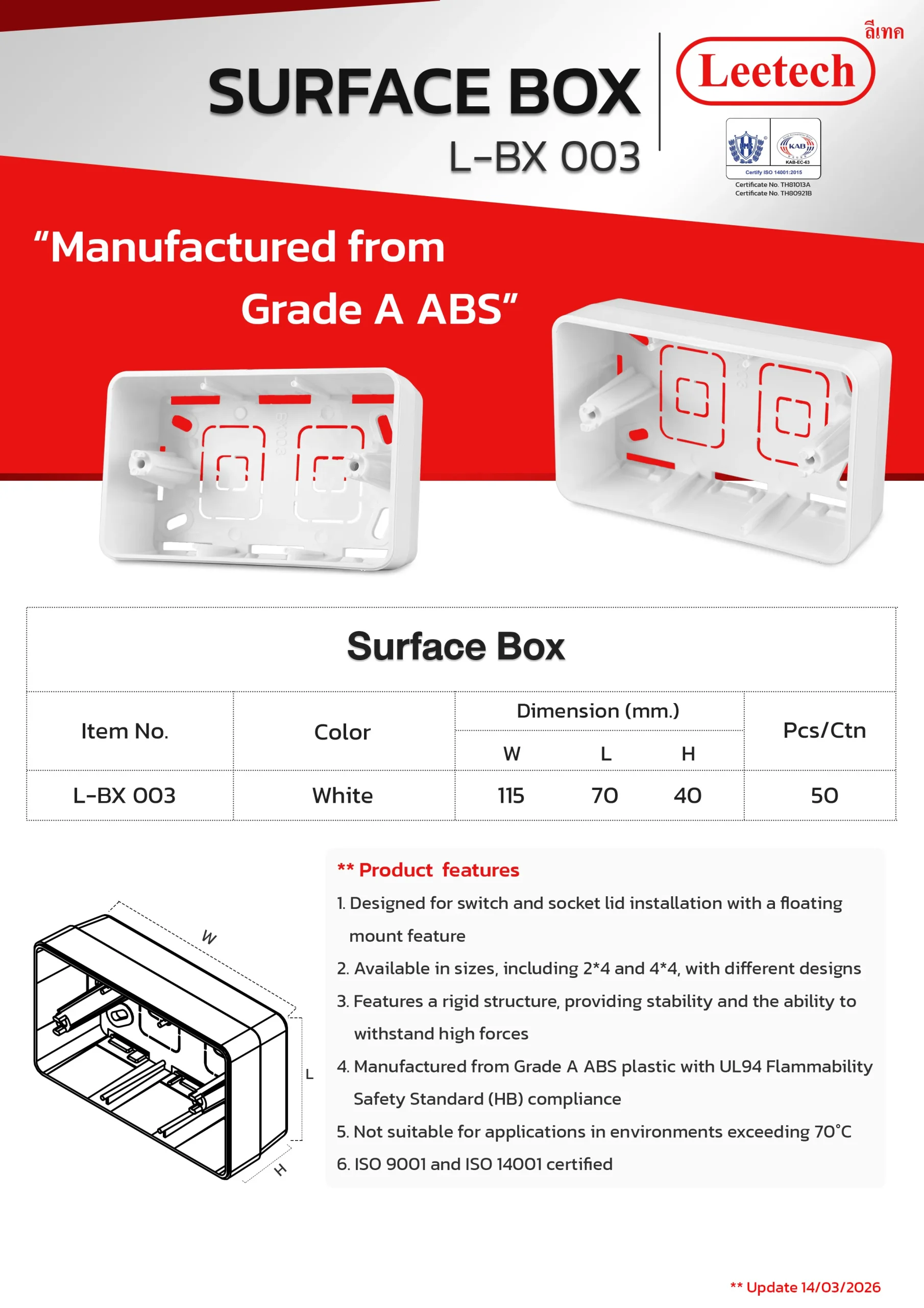 The Leetech Surface Box is designed for switch and socket lid installation with a floating mount feature. It features a rigid structure, providing stability and the ability to withstand high forces and is manufactured from top-grade ABS. Several sizes, including 2*4 and 4*4, with different designs are available to suit the applications.