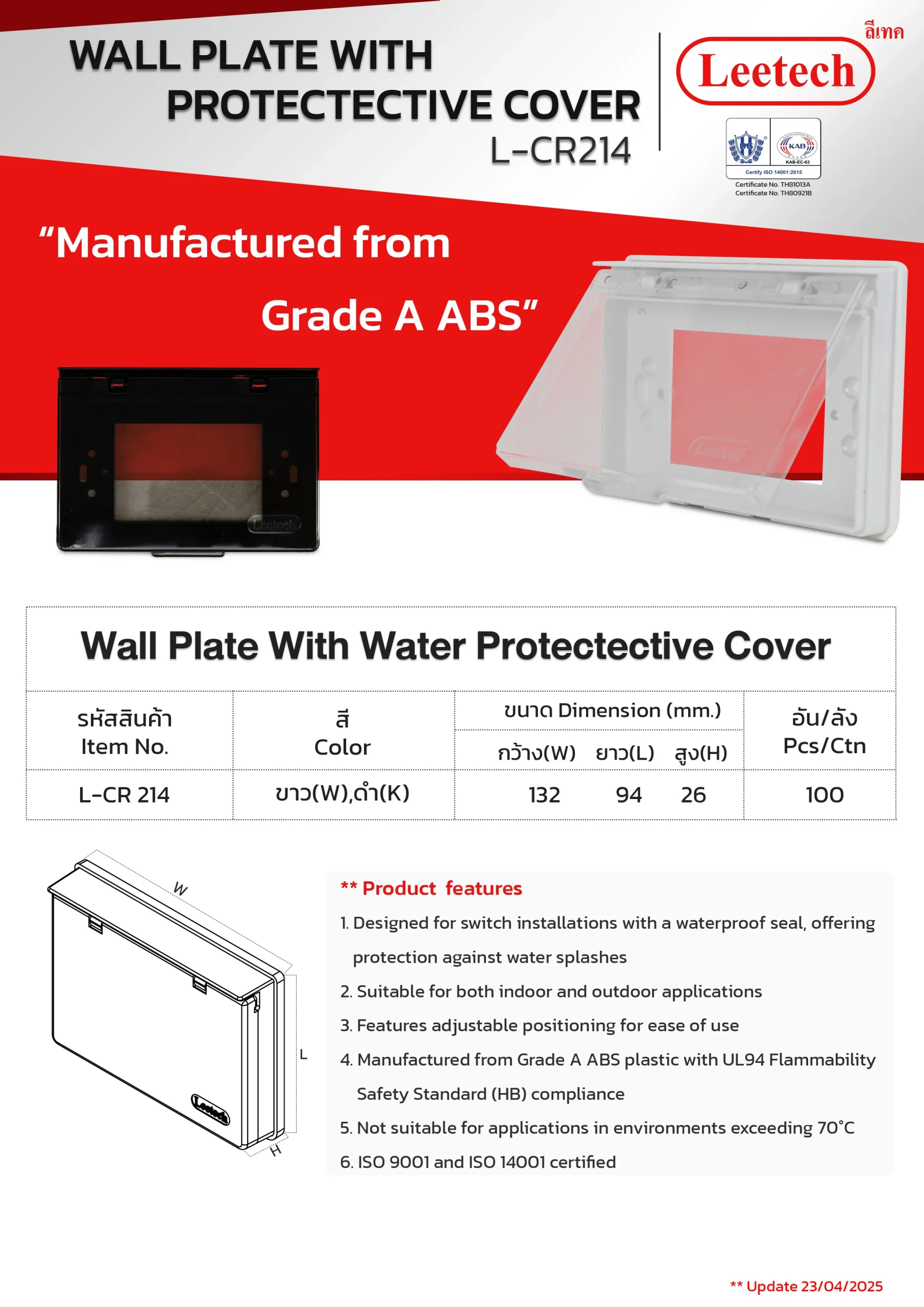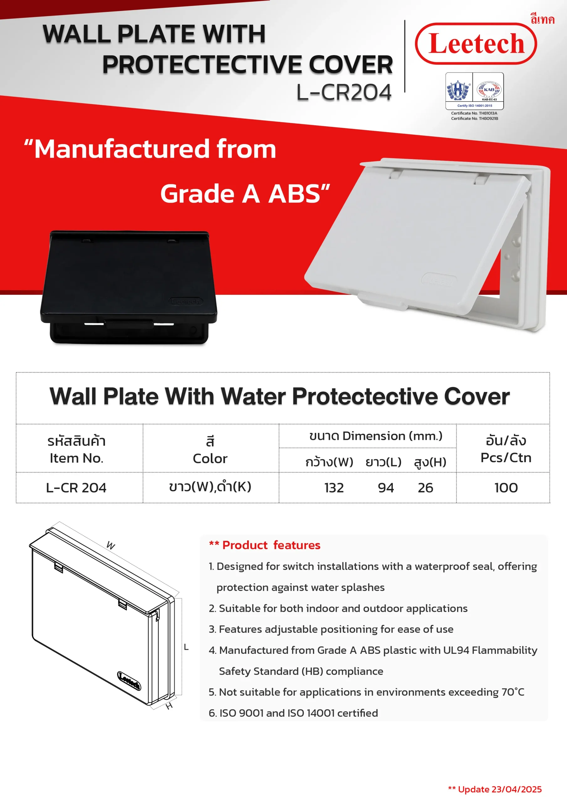 The Leetech Waterproof Cover plate is designed to cover switches for both indoor and outdoor applications with a modern design. The waterproof sealed lid with rubber pad offers protection against water splashes, available in both transparent and opaque options. The flow back of the water is protected with the integrated roof design for extra security. Product manufactured from top-grade ABS plastic, and Polycarbonate for transparent lid.