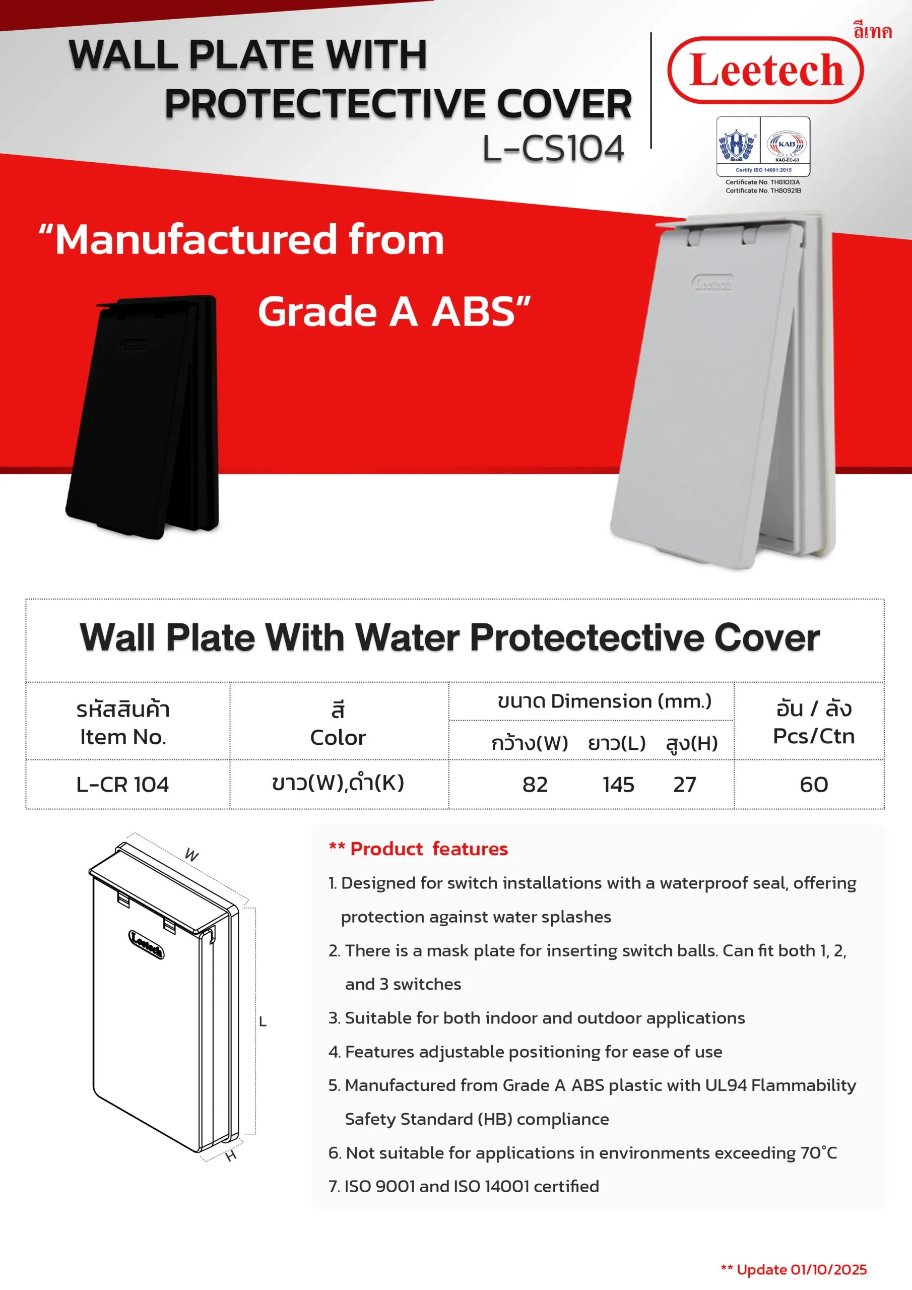 The Leetech Waterproof Cover plate is designed to cover switches for both indoor and outdoor applications with a modern design. The waterproof sealed lid with rubber pad offers protection against water splashes, available in both transparent and opaque options. The flow back of the water is protected with the integrated roof design for extra security. Product manufactured from top-grade ABS plastic, and Polycarbonate for transparent lid.