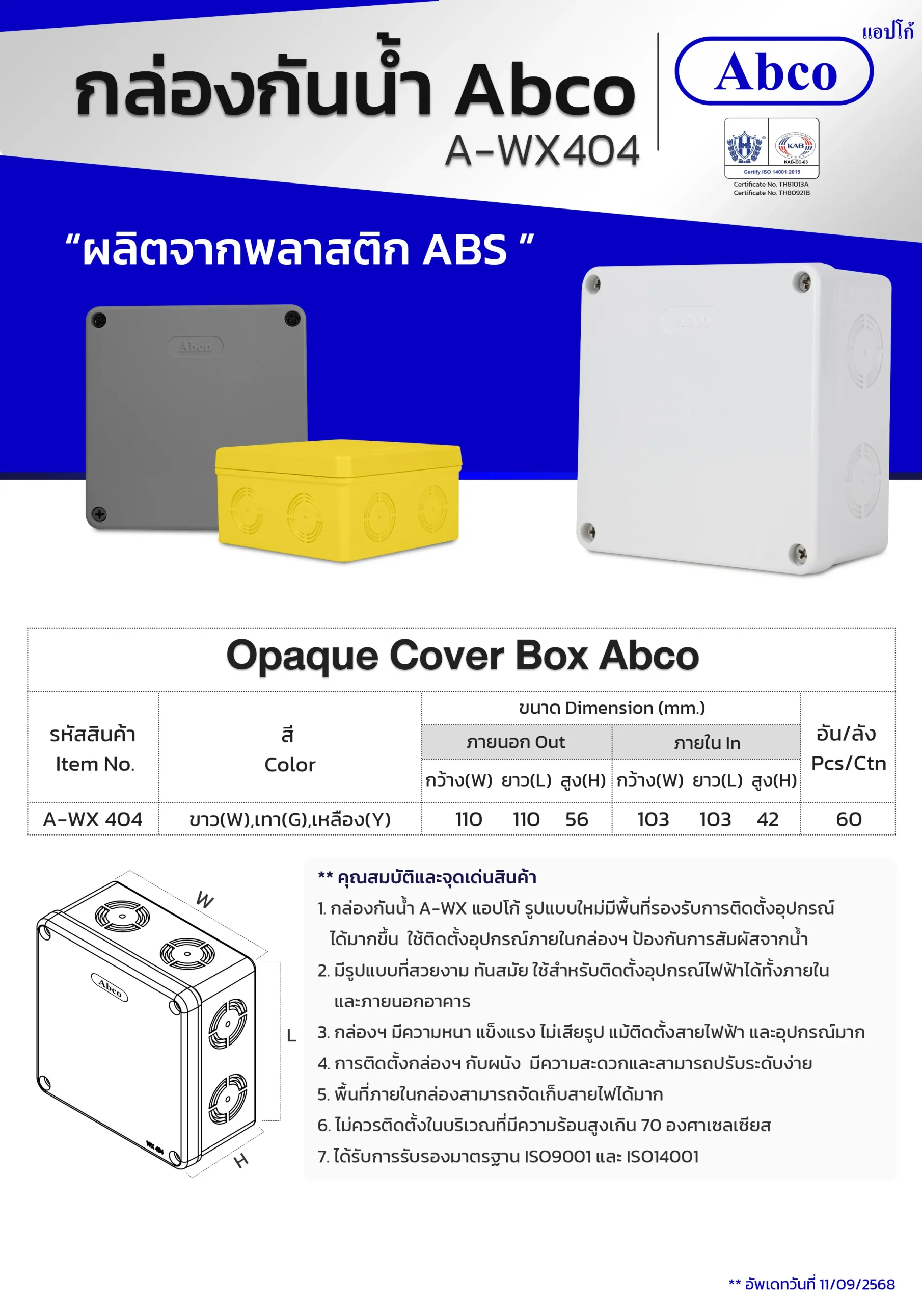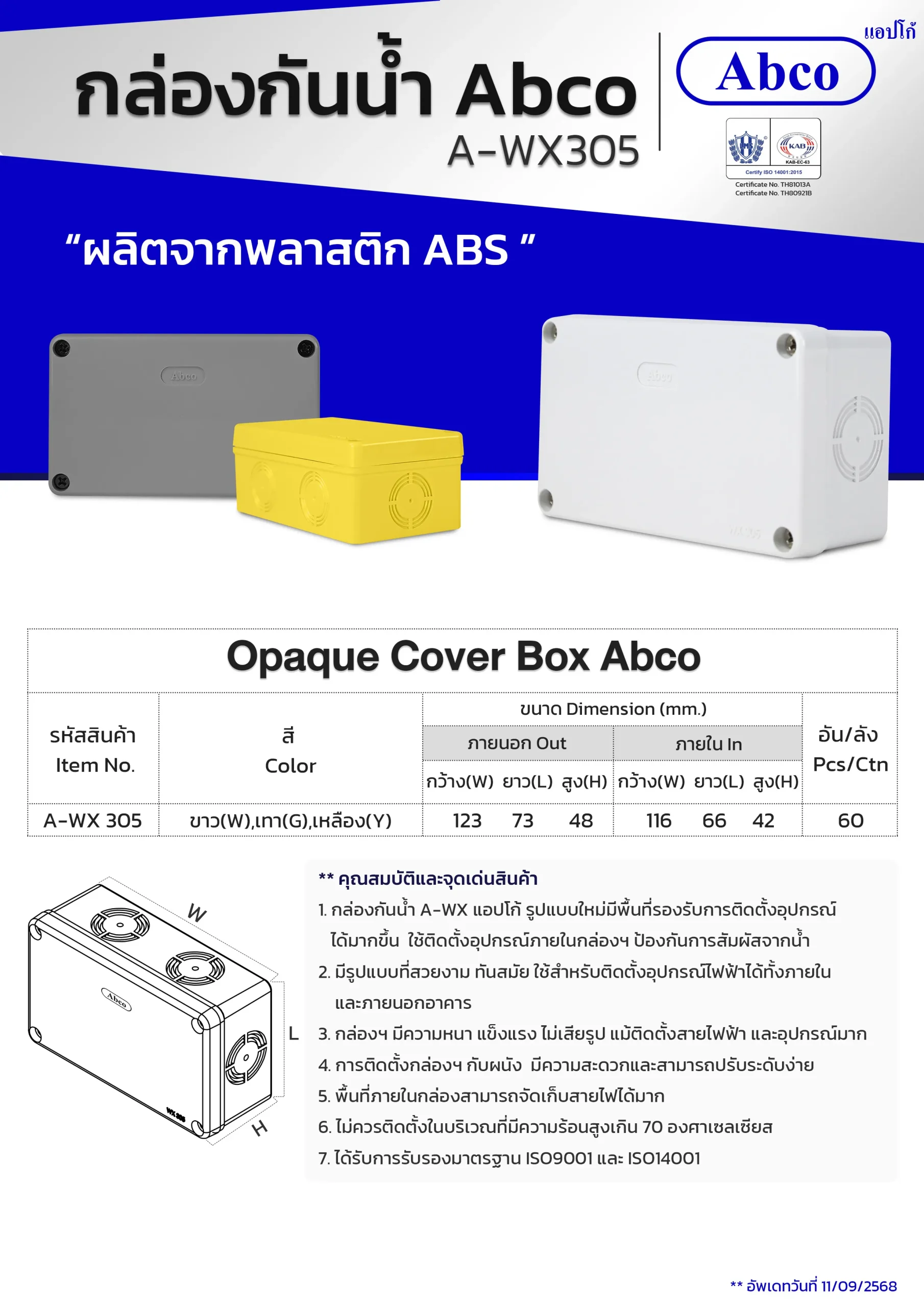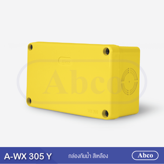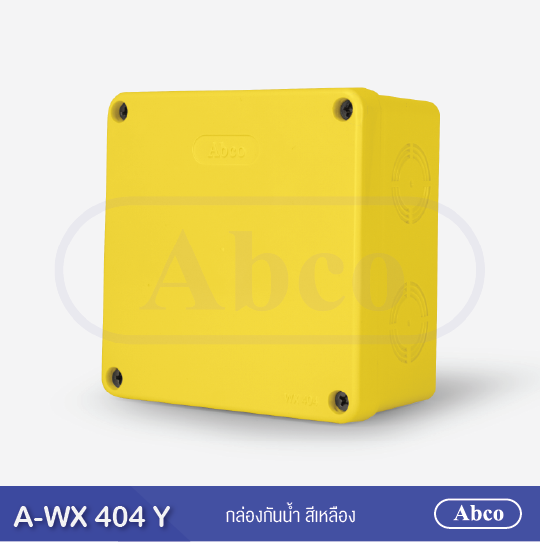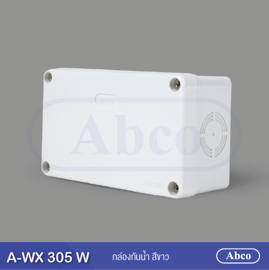 กล่องกันน้ำ A-WX Abco ใช้ติดตั้งอุปกรณ์ไฟฟ้าภายใน และภายนอกอาคาร กันน้ำ และฝุ่นละออง กล่องกันน้ำ ฯ ผลิตจากพลาสติก ABS การออกแบบให้แข็งแรงทนทาน มีรูปลักษณ์ที่สวยงาม และมีขนาดให้เลือกใช้ตามความเหมาะสม สามารถยึดอุปกรณ์ฯ ได้มั่นคง