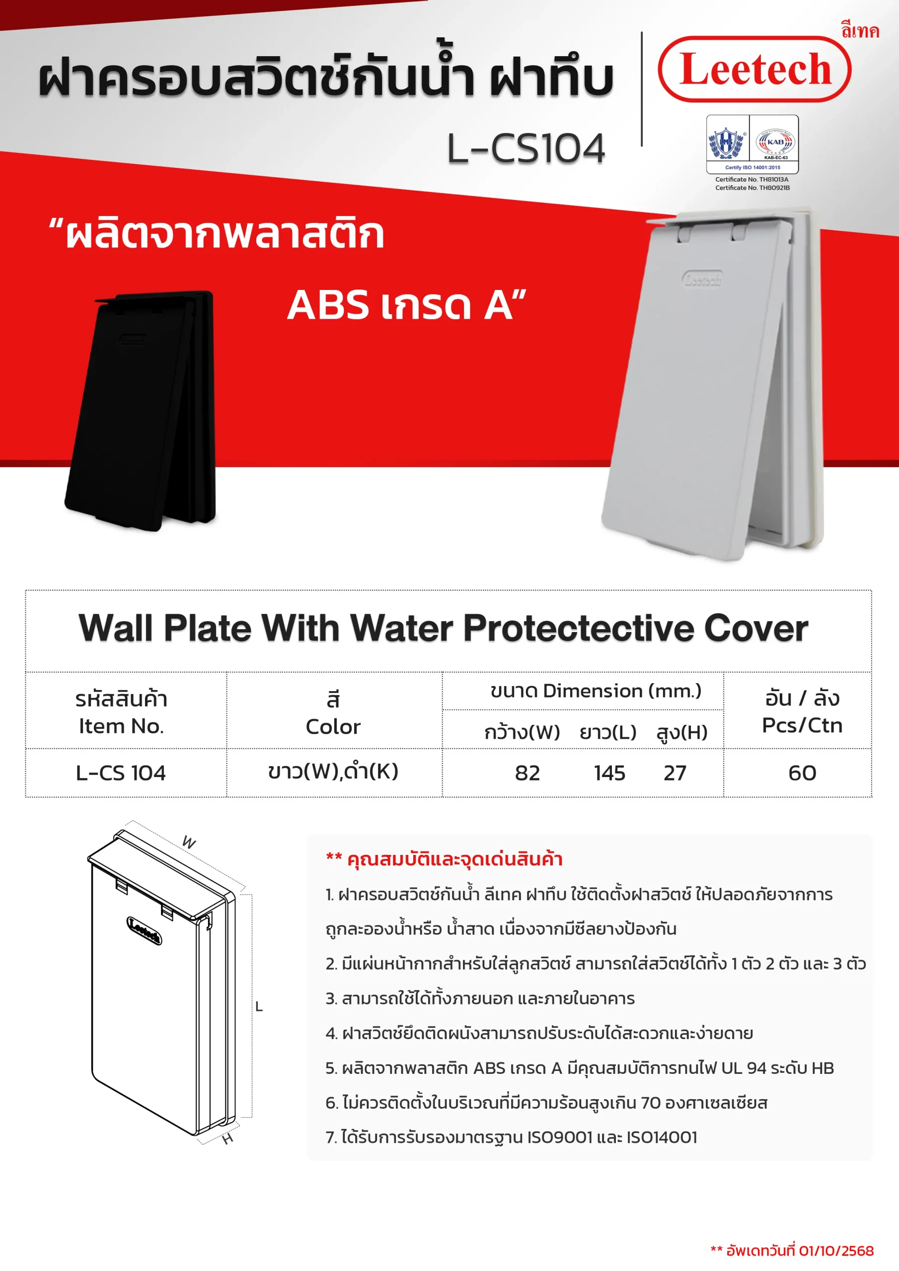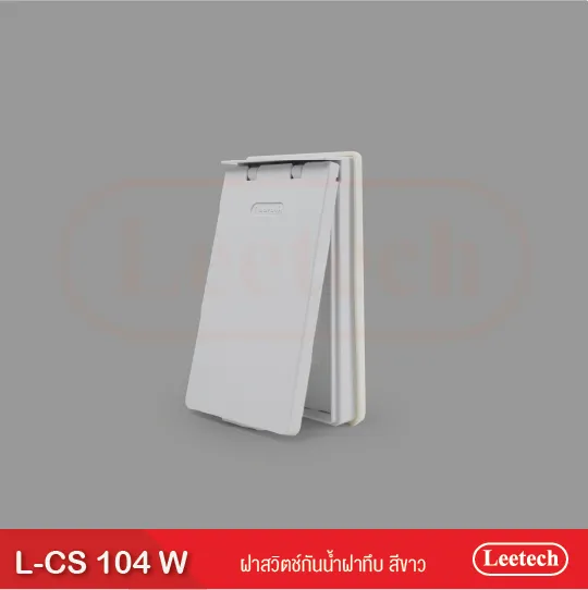 ฝาครอบสวิตช์กันน้ำ Leetech   ใช้ครอบสวิตช์ใช้ภายนอก และภายในอาคาร ฝาปิดเพิ่มความปลอดภัยจากการสัมผัส และละอองน้ำ หรือน้ำสาด มีชนิดฝาทึบ และฝาใส แผ่นยางรองป้องกันน้ำซึมผ่าน และมีหลังคาป้องกันน้ำไหลย้อนกลับ รูปทรงทันสมัย ทนทาน ผลิตจากพลาสติก ABS เกรด A ฝาใสผลิตจากพลาสติก Poly Carbonate