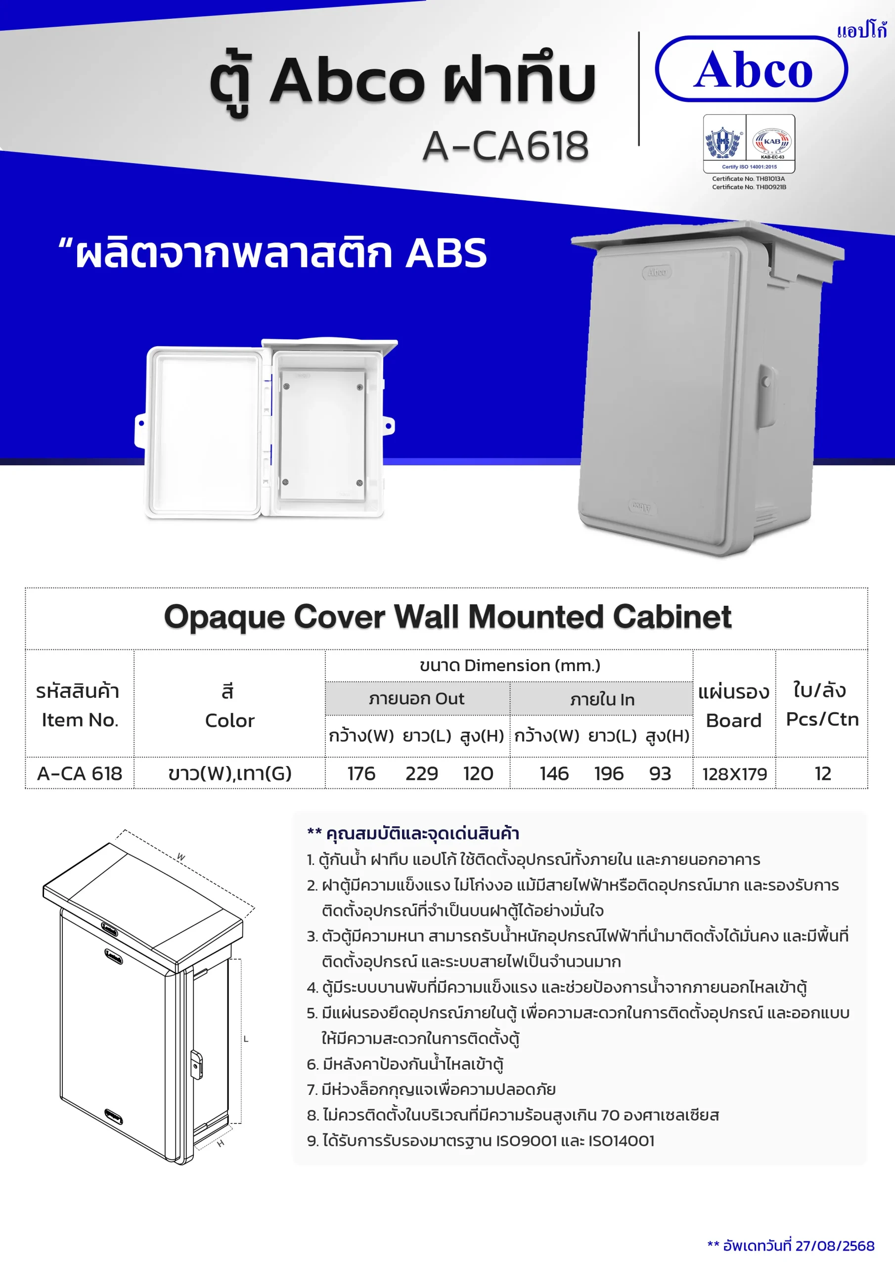 Home / ผลิตภัณฑ์ / ตู้กันน้ำพลาสติก จาก Leetech และ Abco / ตู้กันน้ำ ฝาทึบ Abco A-CA