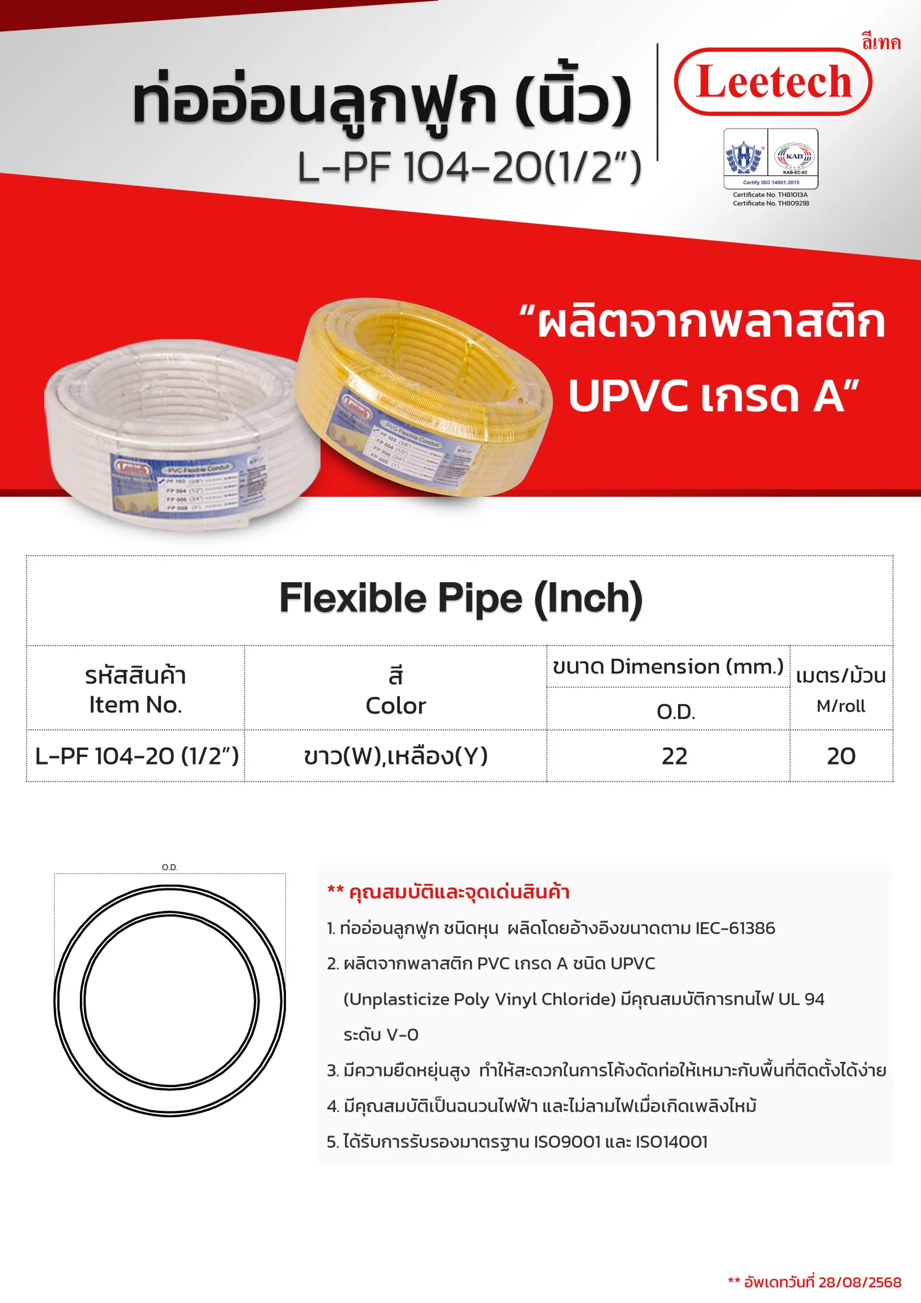 ท่ออ่อนลูกฟูก Leetech มีความอ่อนตัว ยืดหยุ่น ผลิตจาก PVC เกรด A ชนิด UPVC (Unplasticize Poly Vinyl Chloride) มีความเหนียวไม่ฉีดขาดง่าย และทนทานต่อสภาวะอากาศ สามารถใช้งานภายนอกอาคารได้ มีคุณสมบัติเป็นฉนวนไฟฟ้า และไม่ลามไฟ ใช้ร้อยสายไฟฟ้าและสายสัญญาณในพื้นที่ที่จำกัดได้ดี มีหลากหลายขนาด ความยาว และสีให้เลือก