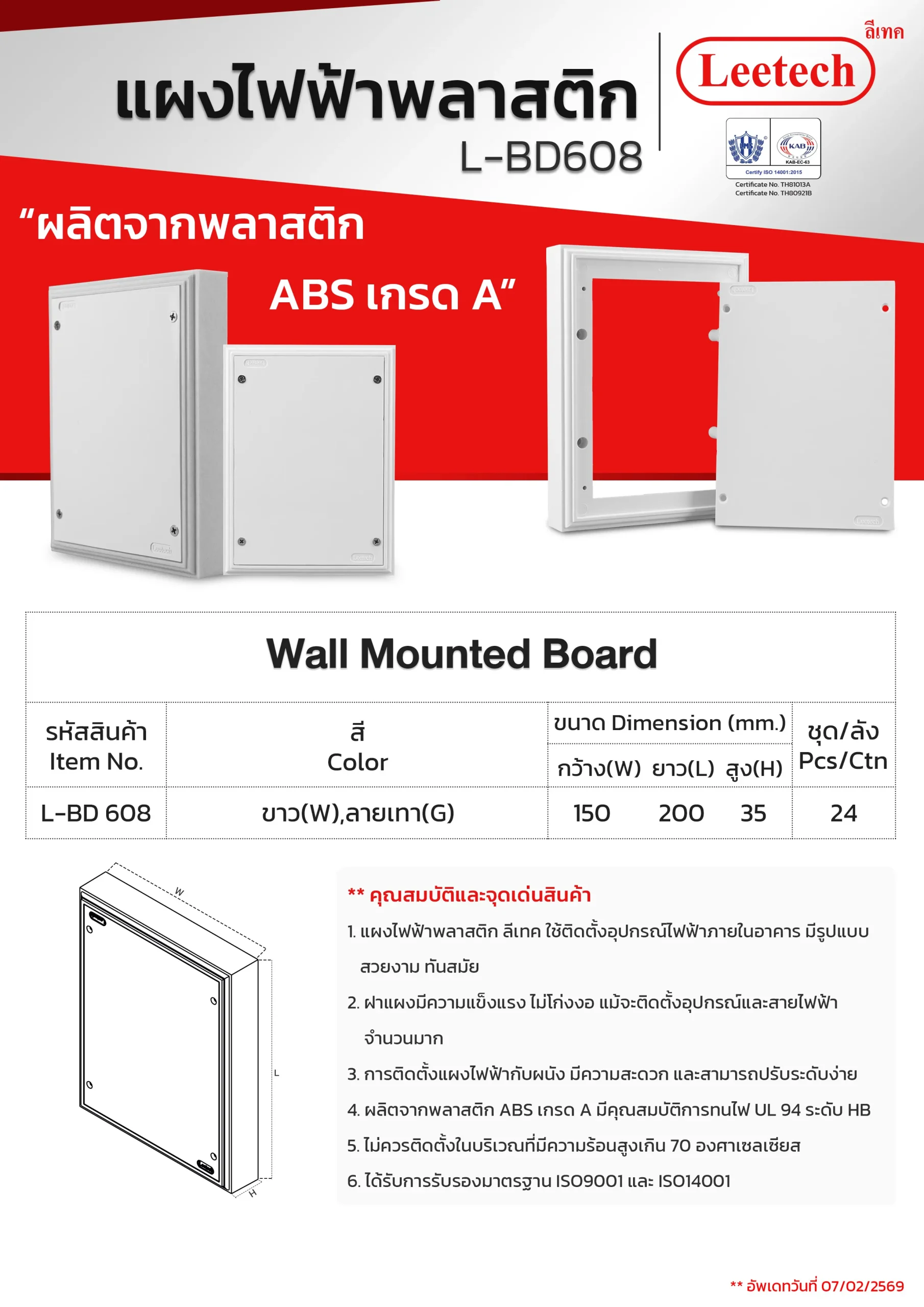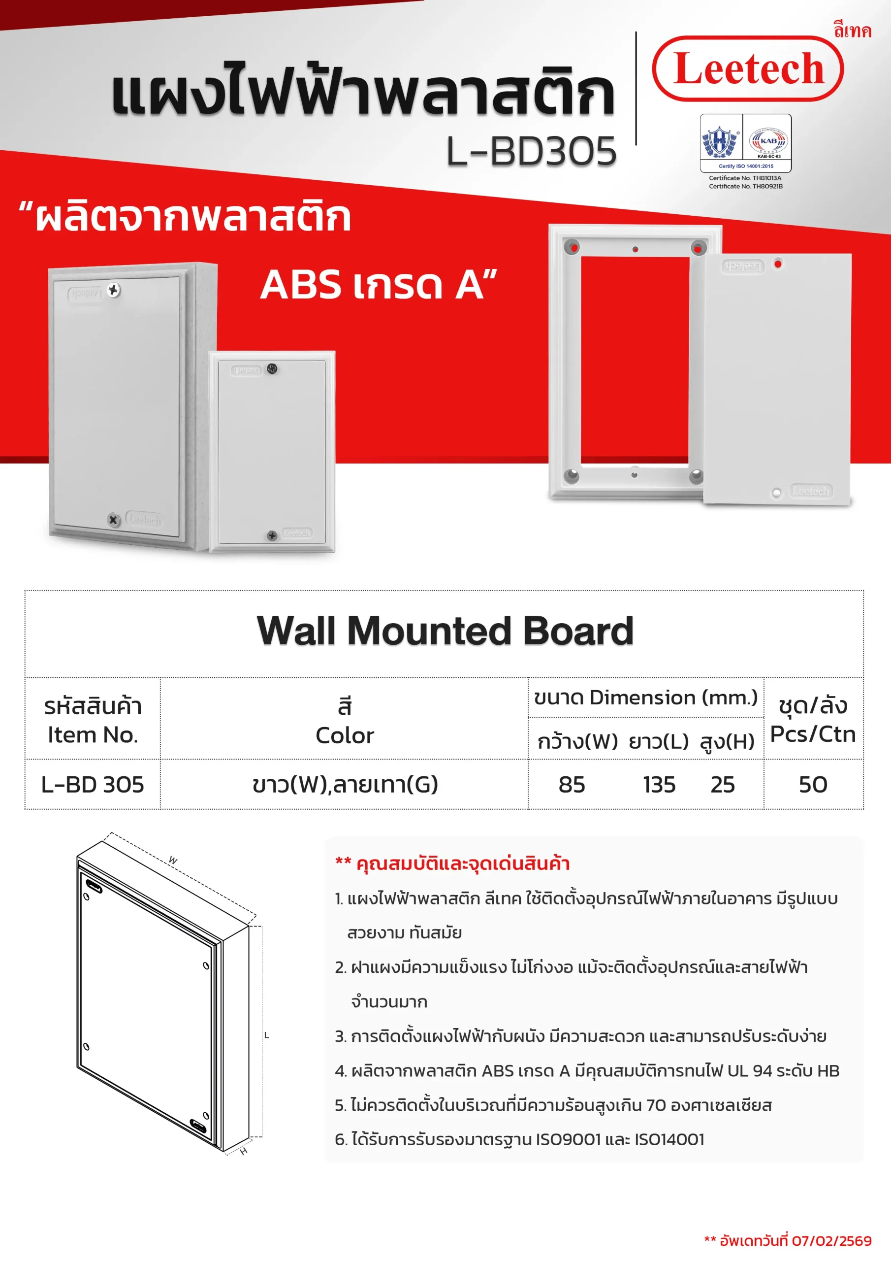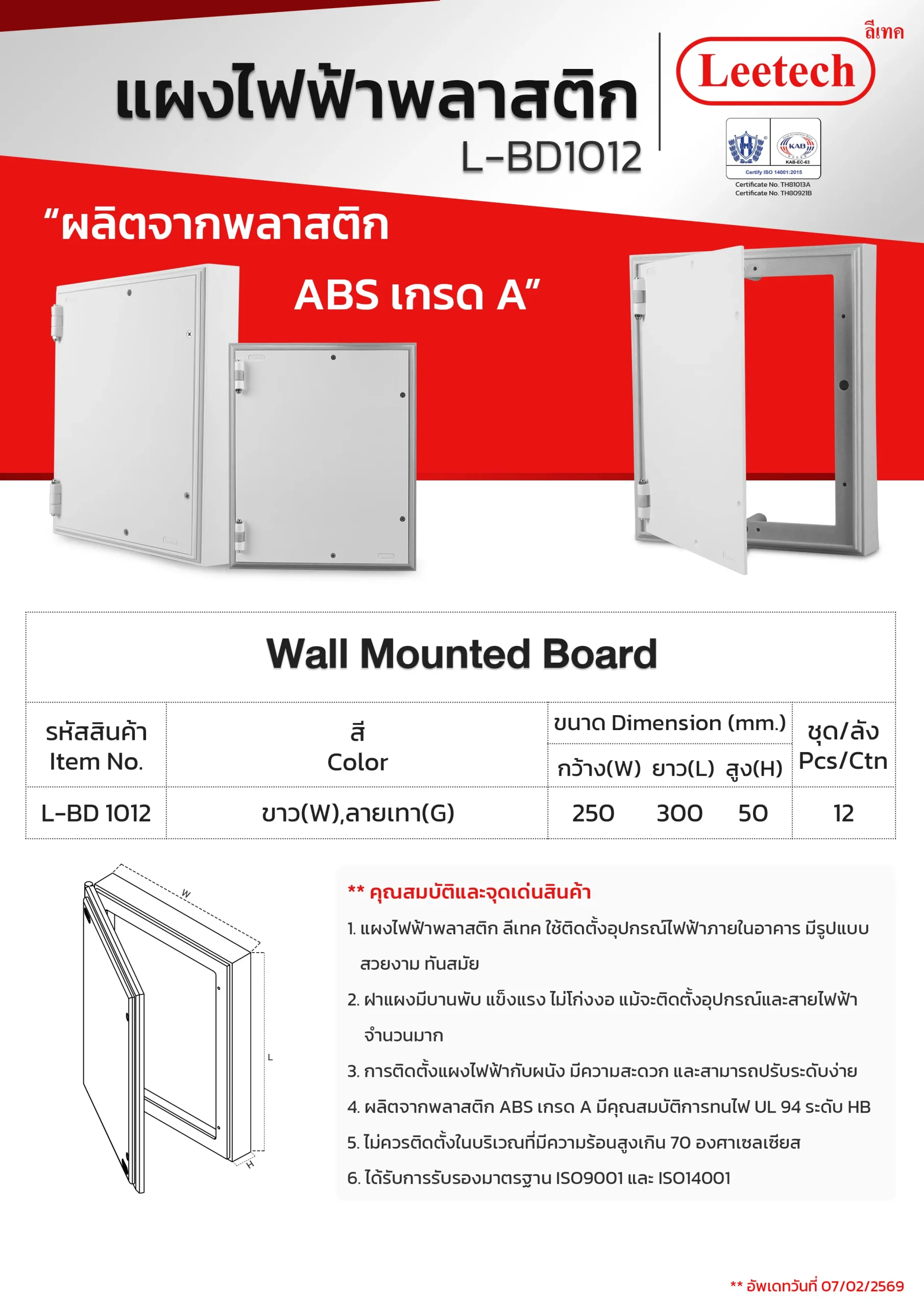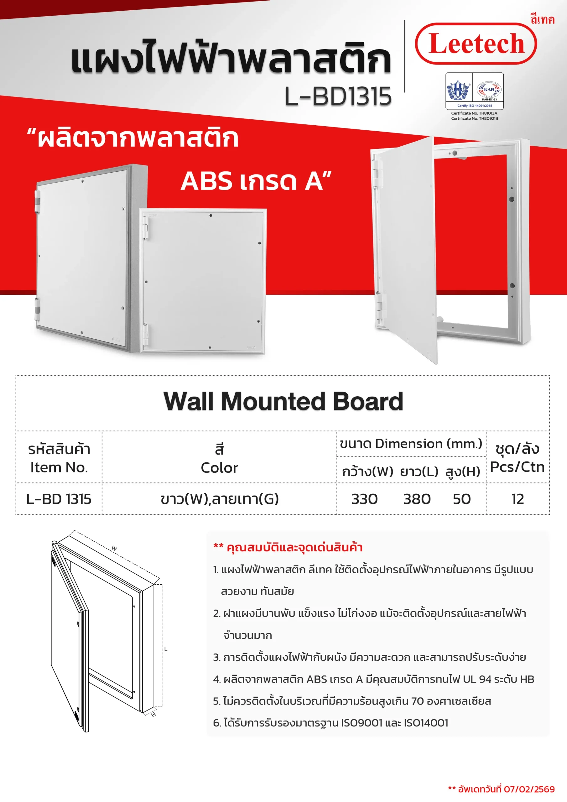 แผงไฟฟ้า Leetech รุ่น (BD) มีรูปแบบที่สวยงาม ผลิตจากพลาสติก ABS เกรด A มีคุณสมบัติการทนไฟ UL 94 ระดับ HB ทนแรงกระแทก และรับน้ำหนักอุปกรณ์ที่นำมาติดตั้งได้ดี ฝาแผงไม่โก่งงอ แม้มีสายไฟฟ้าในแผงมากหรือติดอุปกรณ์มาก เหมาะสำหรับใช้ติดตั้งอุปกรณ์ไฟฟ้าภายในอาคาร ตัวแผงยึดติดผนังสามารถปรับระดับได้สะดวก และง่ายดาย มีให้เลือกหลากหลายขนาด และหลากสีสันเพื่อความเหมาะสมกับการใช้งาน ไม่ควรติดตั้งในบริเวณที่มีความร้อนสูงเกิน 70 องศาเซลเซียส