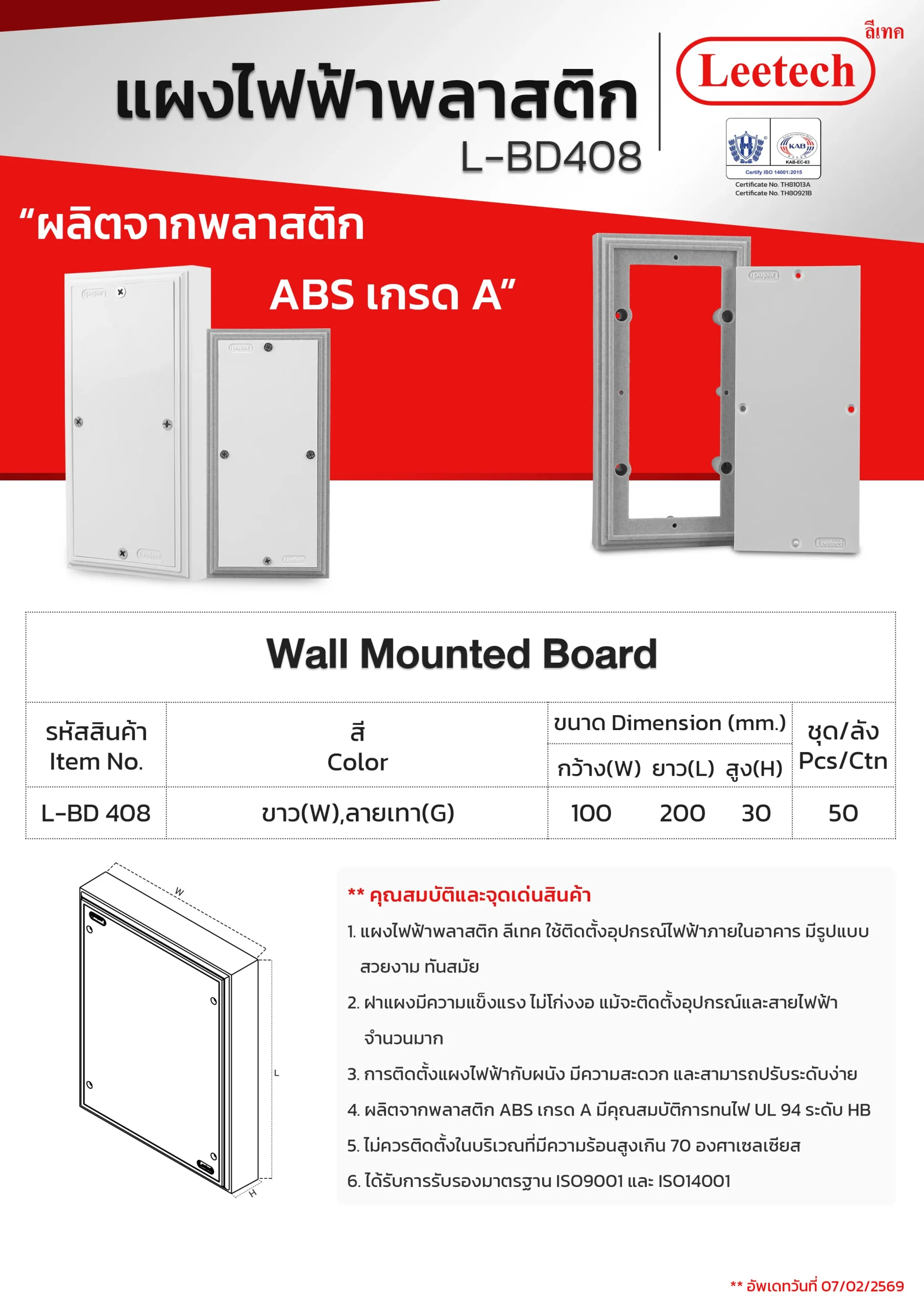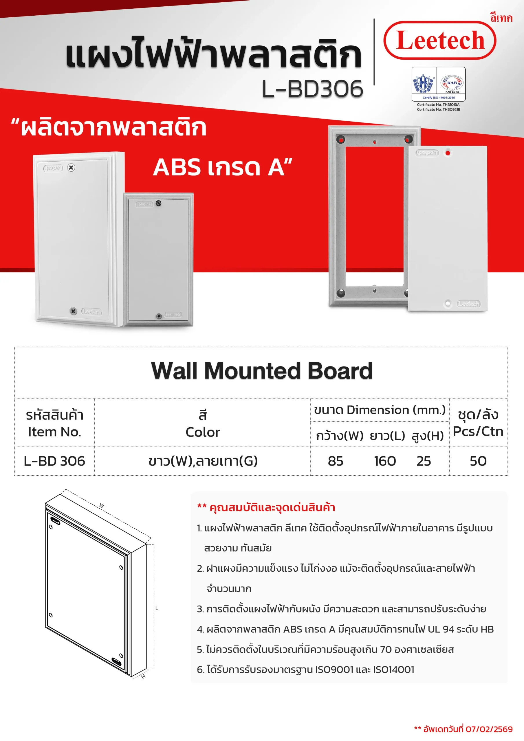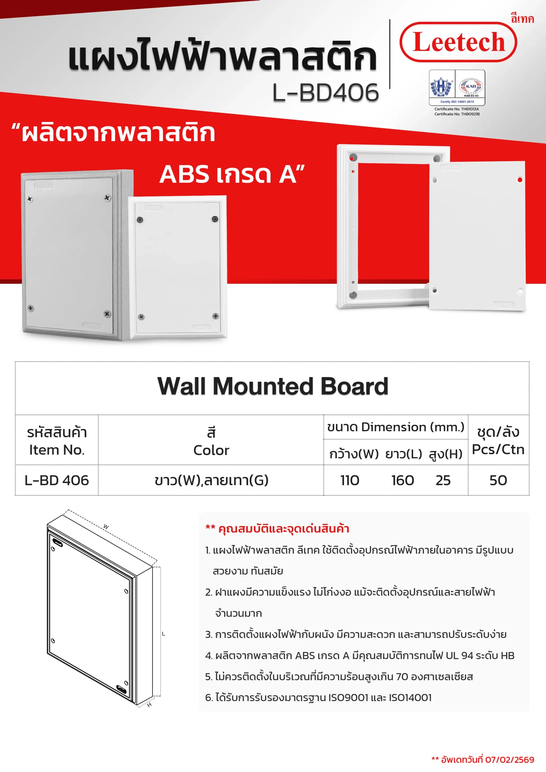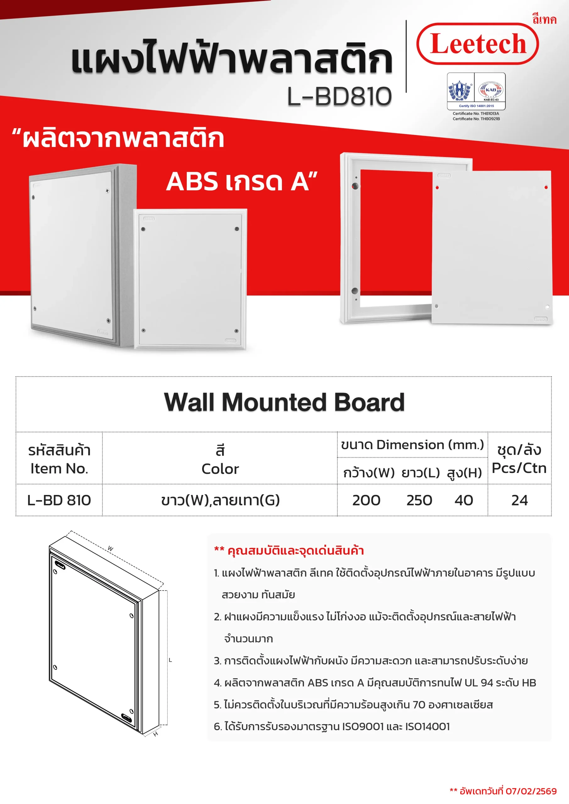 แผงไฟฟ้า Leetech รุ่น (BD) มีรูปแบบที่สวยงาม ผลิตจากพลาสติก ABS เกรด A มีคุณสมบัติการทนไฟ UL 94 ระดับ HB ทนแรงกระแทก และรับน้ำหนักอุปกรณ์ที่นำมาติดตั้งได้ดี ฝาแผงไม่โก่งงอ แม้มีสายไฟฟ้าในแผงมากหรือติดอุปกรณ์มาก เหมาะสำหรับใช้ติดตั้งอุปกรณ์ไฟฟ้าภายในอาคาร ตัวแผงยึดติดผนังสามารถปรับระดับได้สะดวก และง่ายดาย มีให้เลือกหลากหลายขนาด และหลากสีสันเพื่อความเหมาะสมกับการใช้งาน ไม่ควรติดตั้งในบริเวณที่มีความร้อนสูงเกิน 70 องศาเซลเซียส